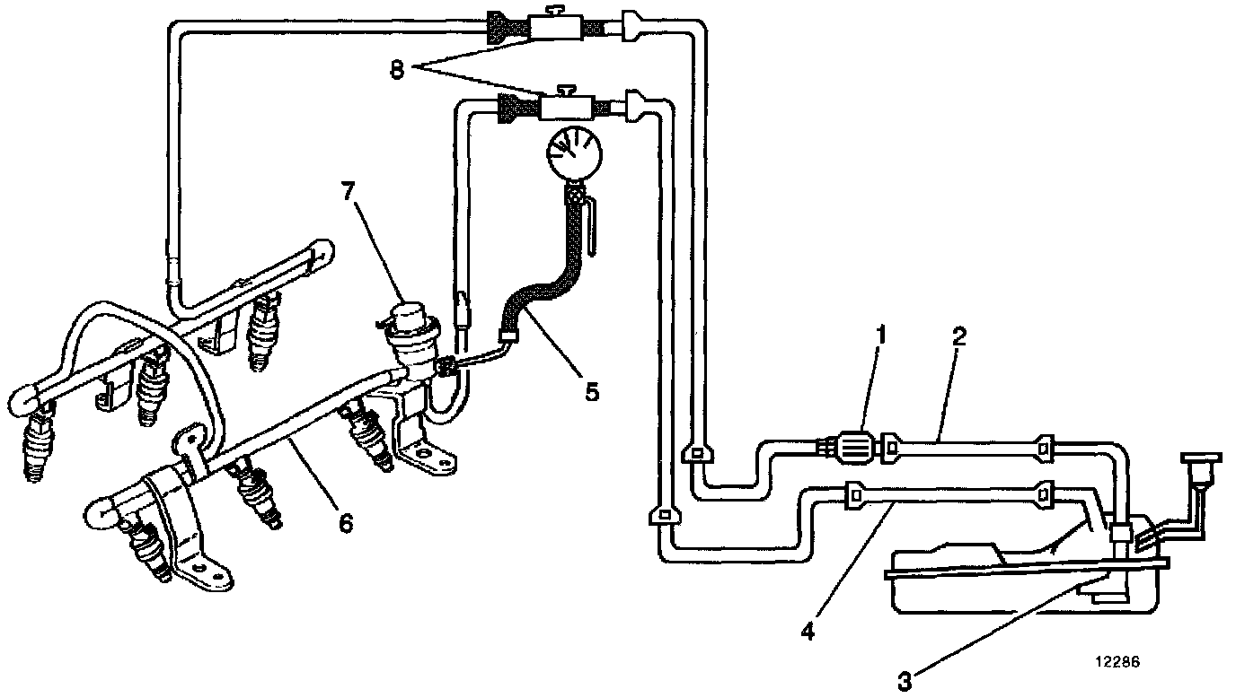 When the ignition switch is turned ON, the Powertrain Control Module (PCM) will turn ON the in-tank fuel pump. The in-tank fuel pump will remain ON as long as the engine is cranking or running and the PCM is receiving reference pulses. If there are no reference pulses, the PCM will turn the in-tank fuel pump OFF 2 seconds after the ignition switch is turned ON or 2 seconds after the engine stops running. The in-tank fuel pump is an electric pump, attached to the Fuel Sender Assembly. The in-tank fuel pump (3) supplies fuel through the fuel feed pipe (2), and in-line fuel filter (1) to the Fuel flail Assembly (6). The fuel pump is designed to provide fuel at a pressure above the pressure needed by the fuel injectors. A fuel pressure regulator (7), attached to the Fuel Rail, keeps the fuel available to the fuel injectors at a regulated pressure. Unused fuel is returned to the fuel tank by a separate fuel return pipe (4). The fuel pressure gauge J 34730-1A(5) and fuel pipe shut off adapters J 37287(8) are used for fuel system diagnosis.