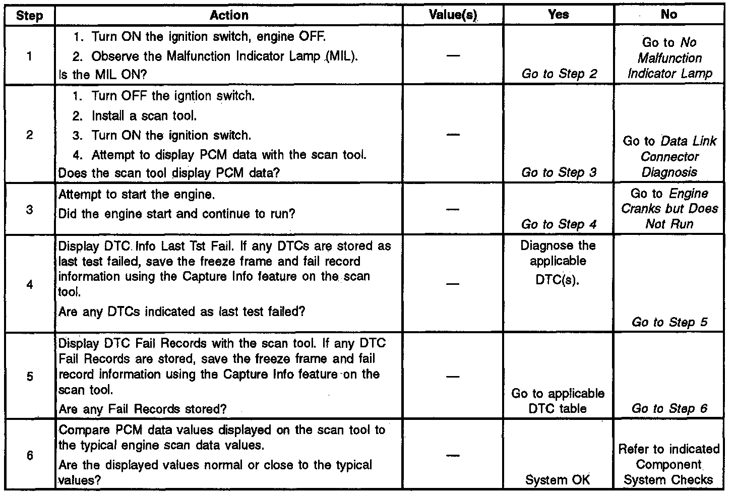 The Powertrain On-Board Diagnostics (OBD) system check is an organized approach to identifying a problem created by an electronic engine control system malfunction. The Powertrain OBD system check must be the starting point for any driveability complaint diagnosis. The Powertrain OBD system check directs the service technician to the next logical step in diagnosing a complaint. Do not perform this check off no driveability complaint exists. Understanding the table and using it correctly will reduce diagnostic time and prevent the replacement of good parts.