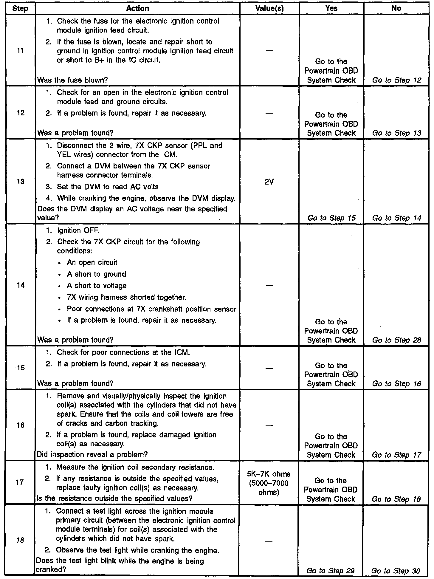 8. Checking for spark at an ignition wire will determine if the problem is with the 7X crankshaft position sensor input to the Ignition Control Module (ICM). A blinking injector test light with no spark suggests a fault condition in the ignition system. By using J 26792 (ST 125) to test for spark at the ignition coil towers, each ignition coils ability to produce at least 25,000 volts is verified.