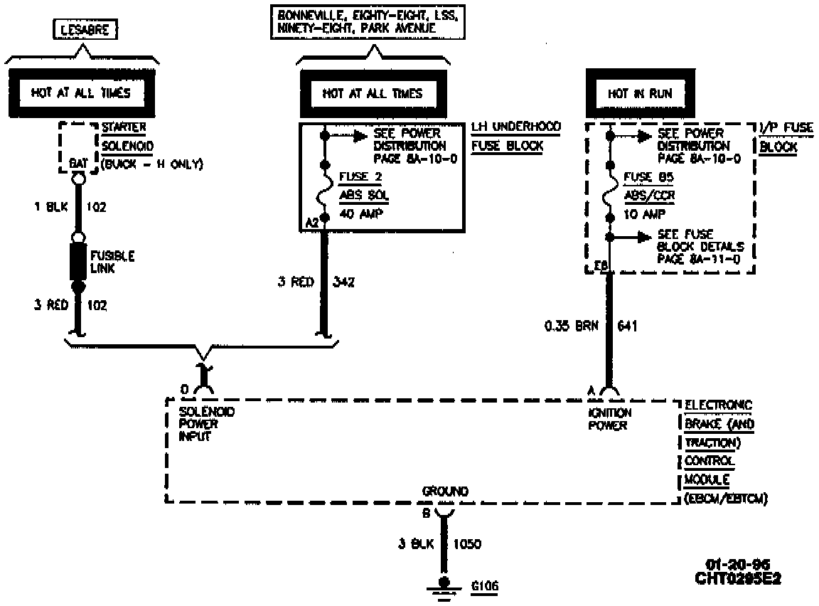 The ABS/TCS receives power from three circuits. CKT 642 supplies battery power to the pump motor. CKT 342, or CKT 102 if a LeSabre, supplies battery power to the solenoid valves, the EBCM/EBTCM, and the coil of the pump motor relay. CKT 641 supplies battery power to initialize controller operations. It also supplies power to the solenoid valve relay.