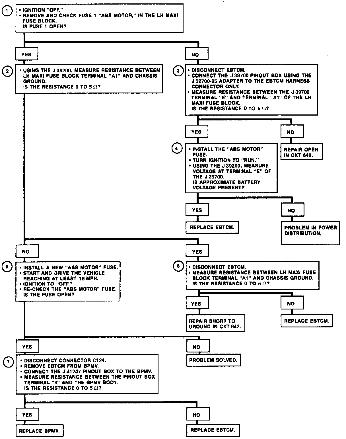 The Power Distribution system does not supply battery voltage to CKT 642. Fuse 1 (ABS Motor) is open. CKT 642 has a wiring problem, terminal corrosion, or poor connections. There is an internal malfunction in the EBCM/EBTCM or the BPMV.