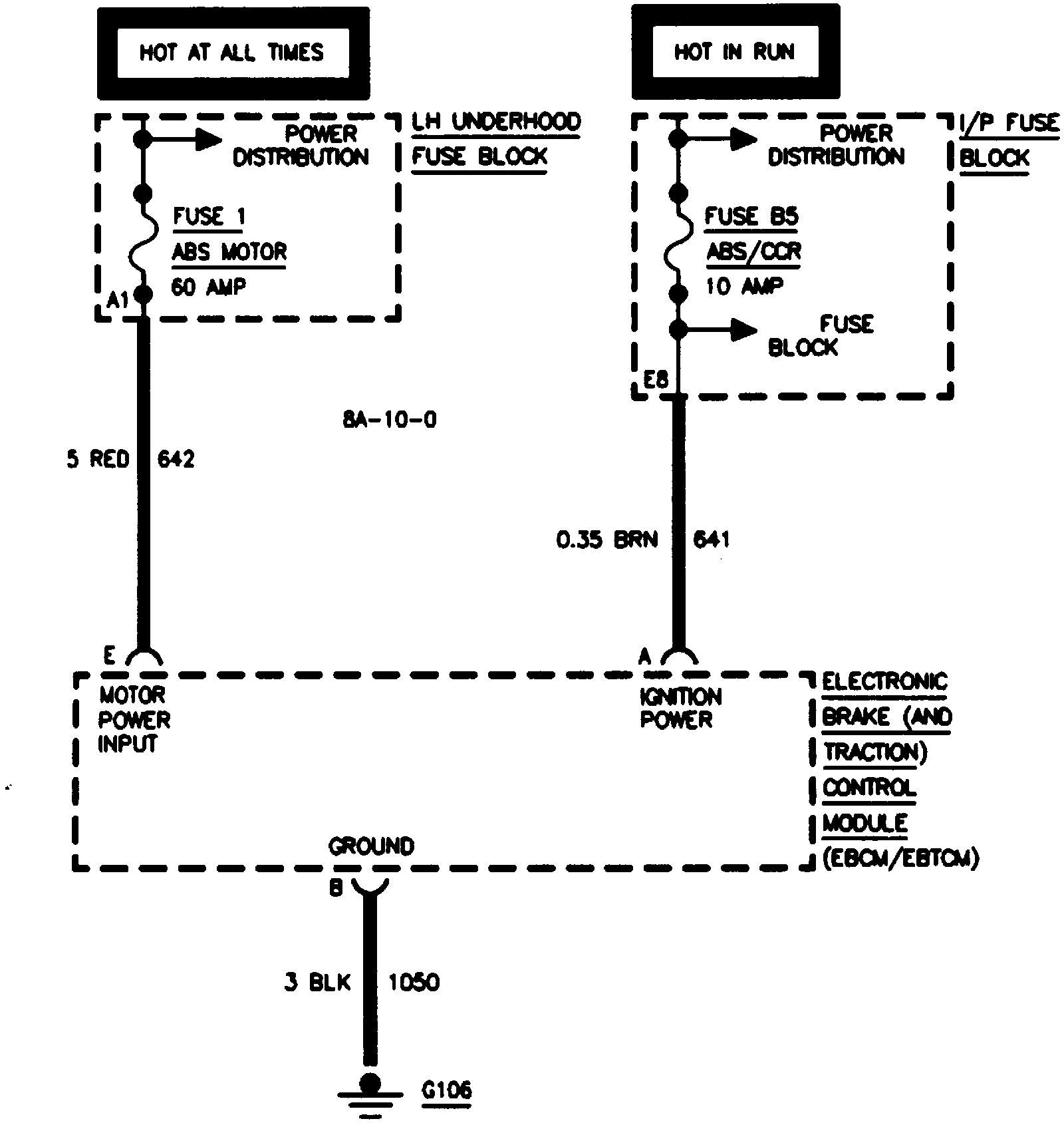 The ABS/TCS receives power from three circuits. CKT 642 supplies battery power to the pump motor. CKT 342 supplies battery power to the solenoid valves, the EBCM/EBTCM, and the coil of the pump motor relay. CKT 641 supplies battery power to initialize controller operations. It also supplies power to the solenoid valve relay.