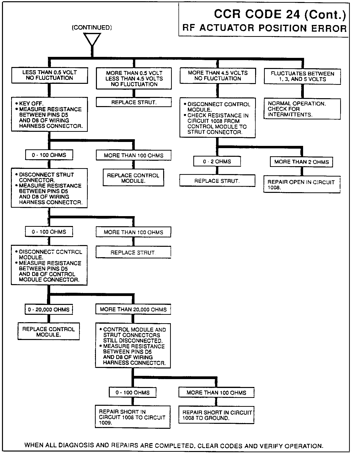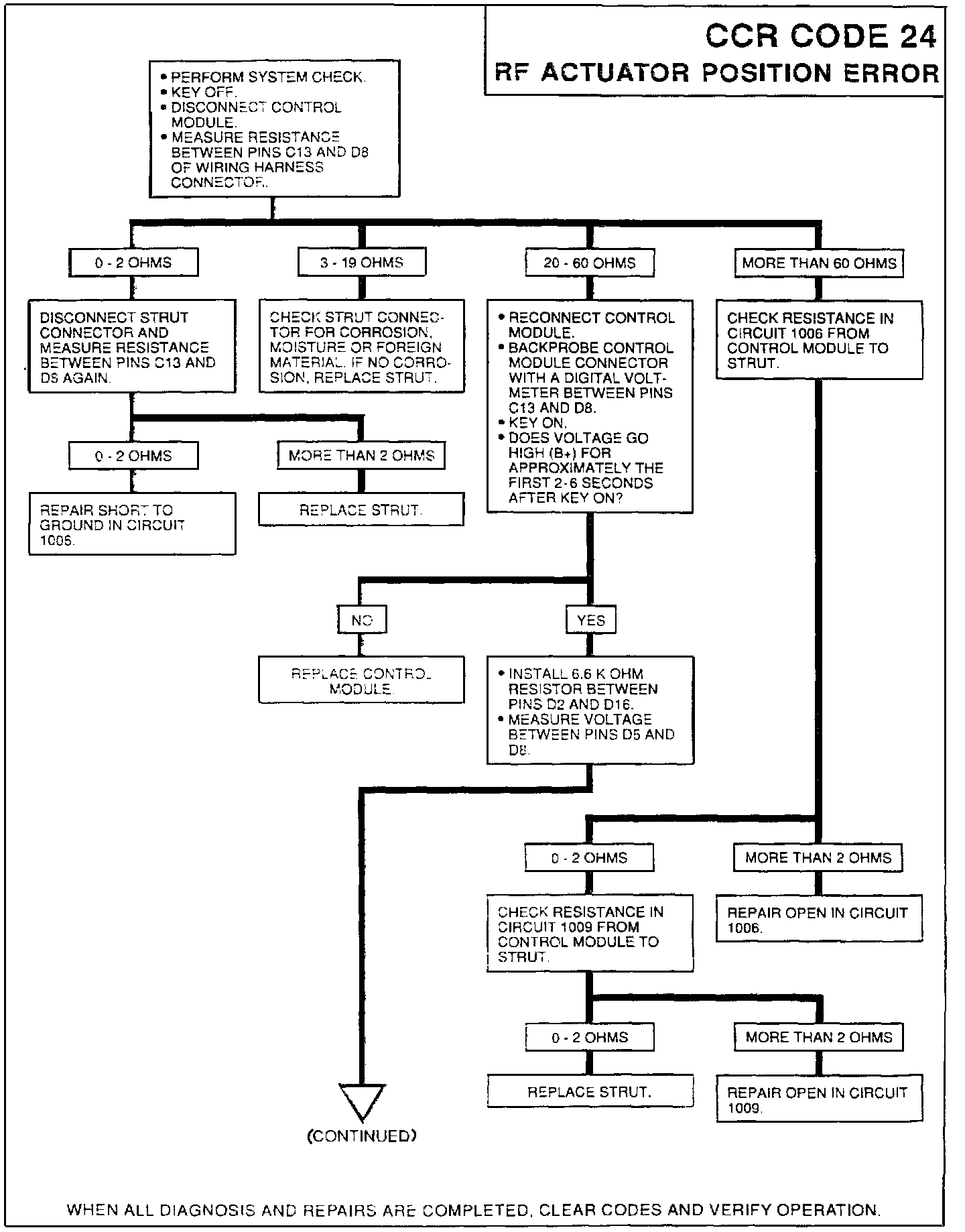An actuator position fault occurs when the actuator position feedback signal has not achieved and remained at the commanded actuator position within 6 seconds after the actuator has been activated. Actuator position faults result in deactivating the faulted actuators, storing error codes 23, 24, 25 or 26, and activating the driver select switch L.E.D.'s. The system will continue to operate all nonfaulted actuators normally. Recovery of the faulted actuators will occur after a successful one second self diagnostic test which is repeated every 3 minutes until all faults are cleared. A mismatch of the commanded feedback signal and the actual feedback signal which occurs after the 6 seconds will not be detected as an error. The actuators will not be repositioned until the CCR system commands a new actuator position as a result of new speed / lateral accelerator switch inputs or a 3 minute retest.
