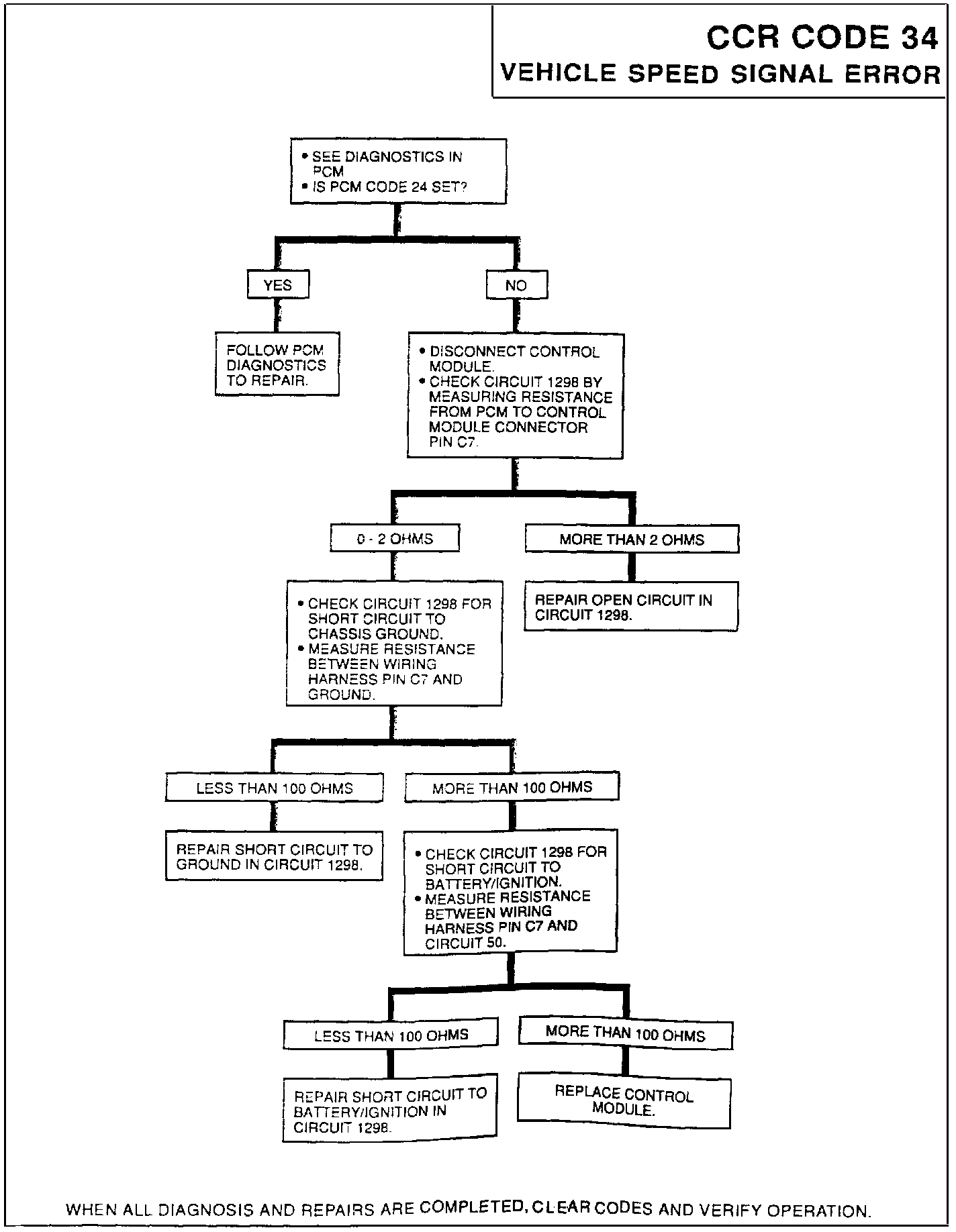 A vehicle speed signal error occurs when the Control Module detects 5 or more transitions in the lateral accelerator switch input after 20 or more seconds without a vehicle speed input. If a fault is detected, the system will set error code 34 and activate the error lamp.