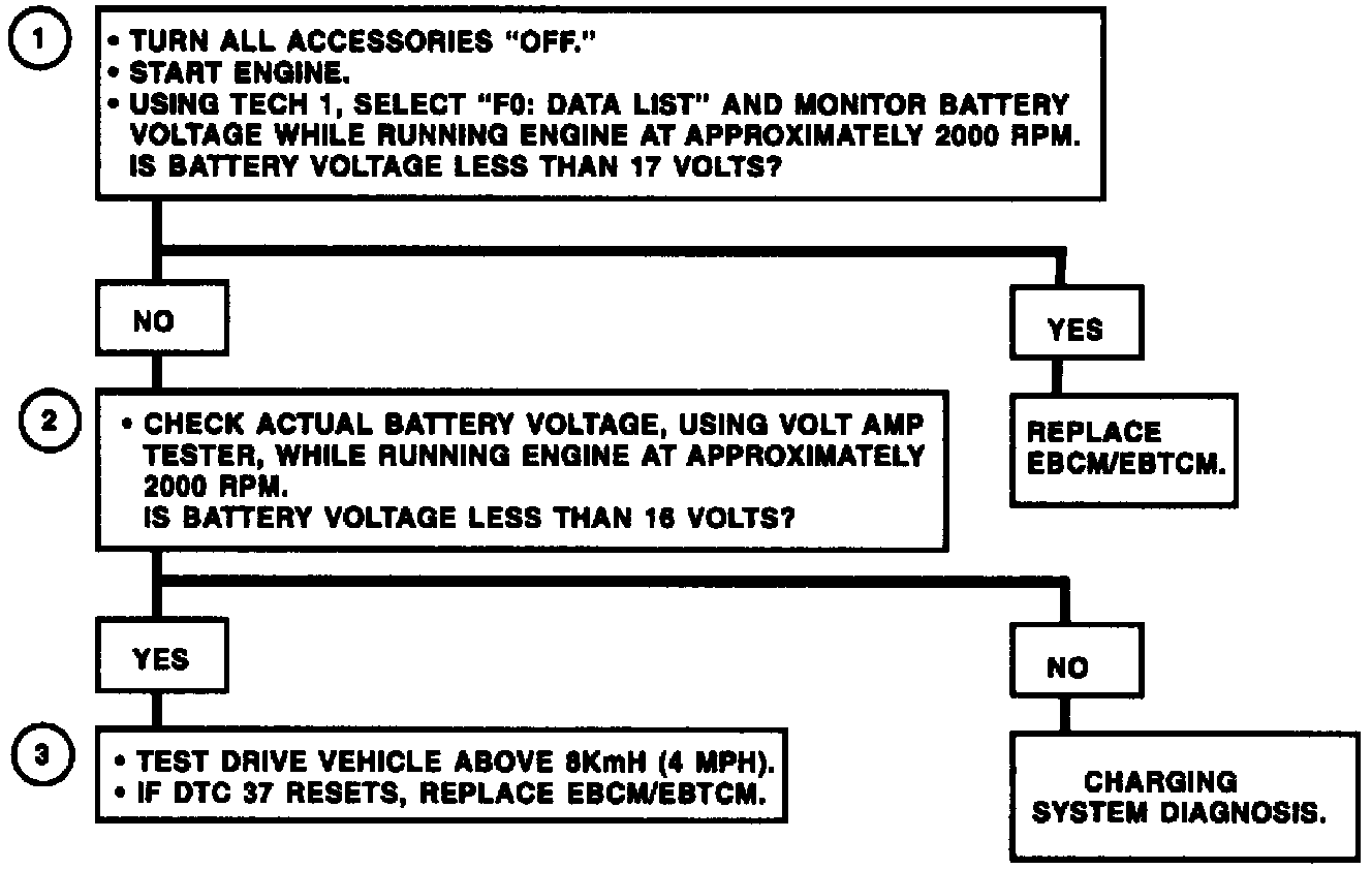 DTC 37 can only be set if the vehicle's speed is greater than 8 km/h (4 mph). If the solenoid power input voltage is greater than 17 volts, a malfunction exists.