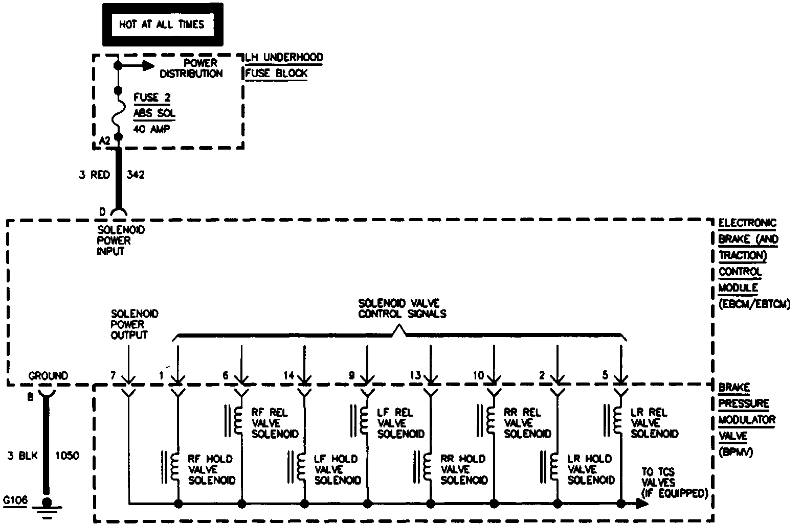 The wheel valve solenoid circuits are supplied with battery power when the ignition is in the "RUN" position. The EBCM/EBTCM controls the valve functions by grounding the circuit when necessary.