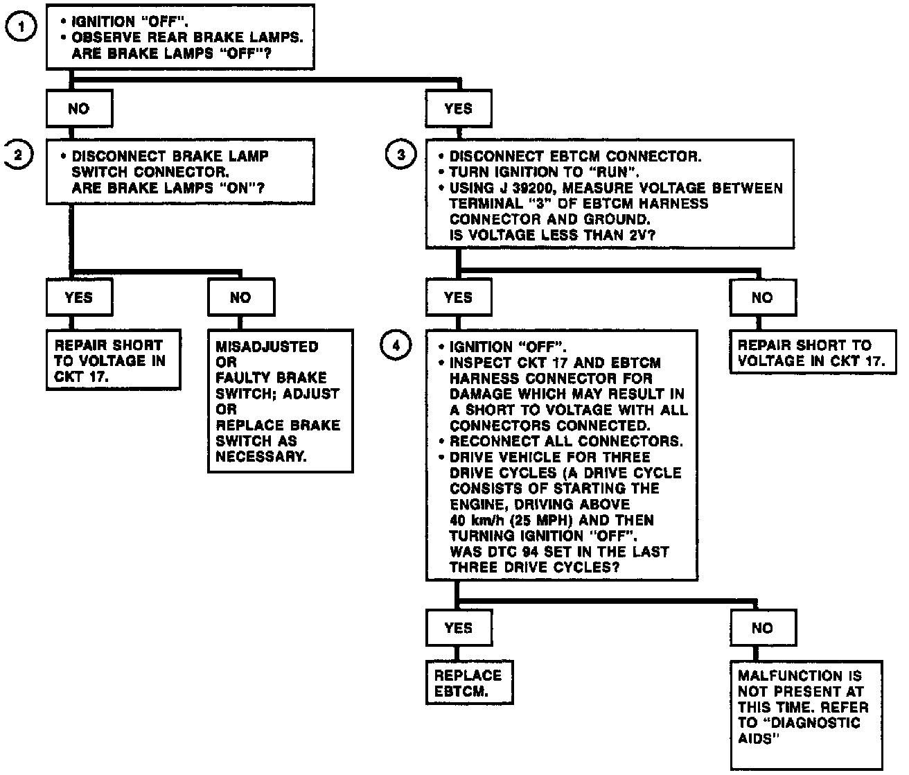 DTC 94 can be set if the vehicle speed reaches at least 40 km/h (25 mph). If the brake was never "OFF" during two consecutive ignition cycles, a malfunction exists.