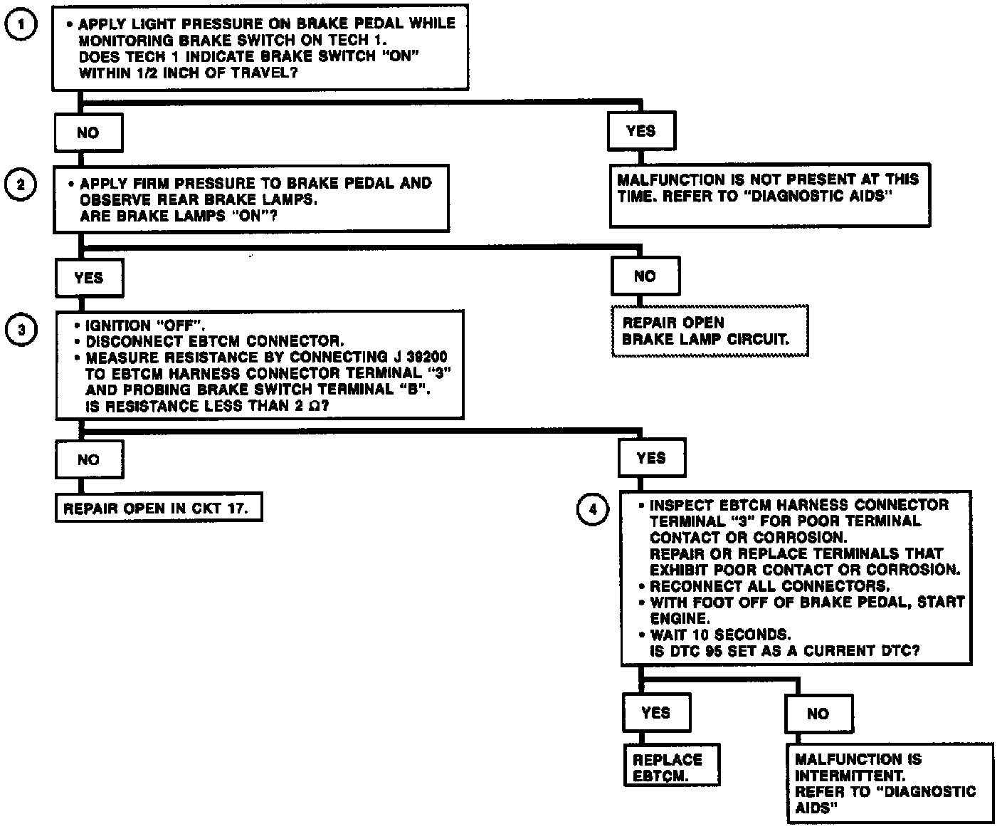 DTC 95 can be set after initialization is completed. If the brake switch input voltage is out of specification for one second indicating an open circuit, a malfunction exists.