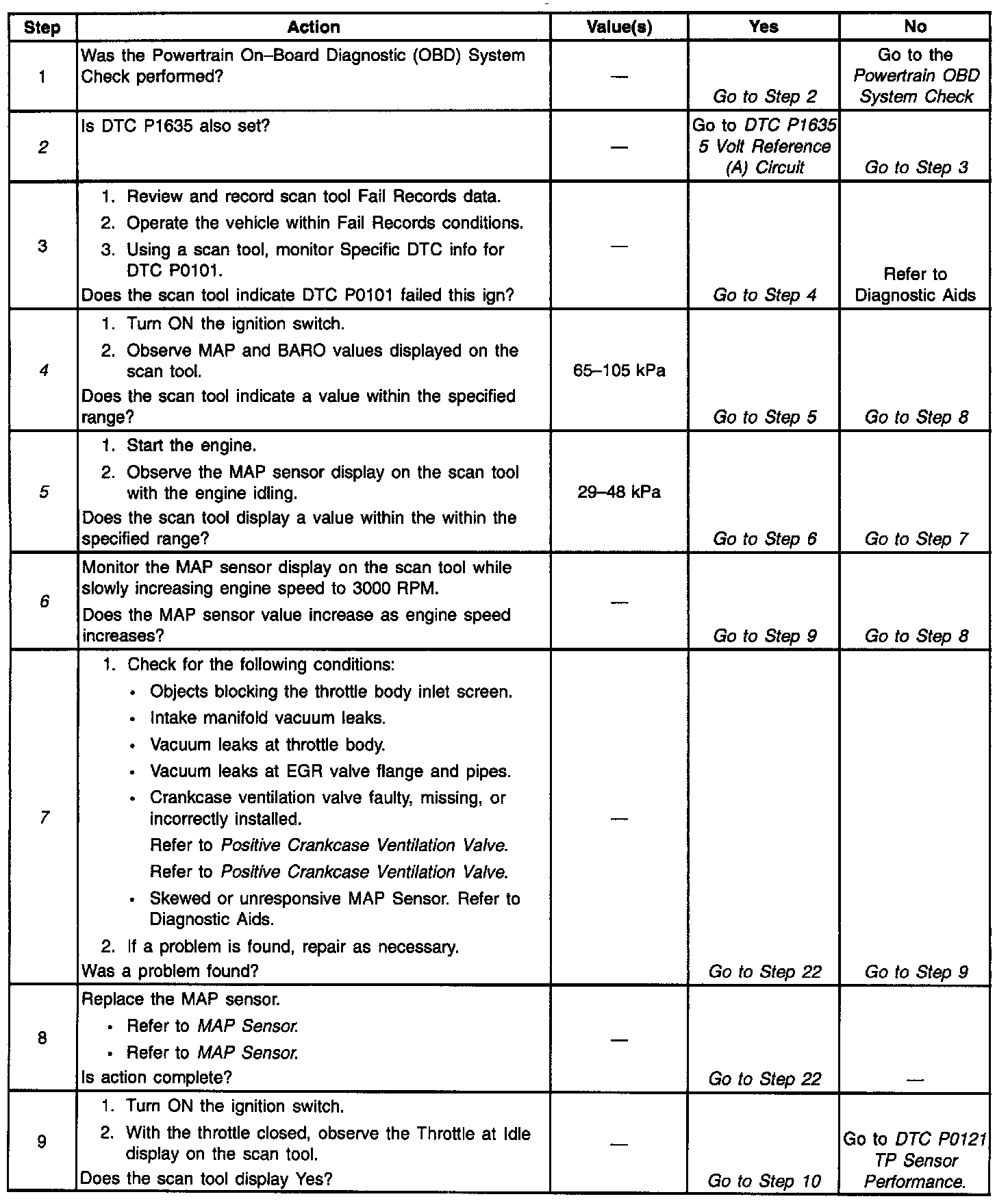 4. This step verifies a proper MAP/BARO value at initial key ON. If the MAP sensor is stuck the barometric pressure value will be incorrectly calculated. This will cause the predicted Mass Air Flow calculations to be inaccurate. DTC P0101 will set if the MAF sensor signal does not match the predicted MAF value.