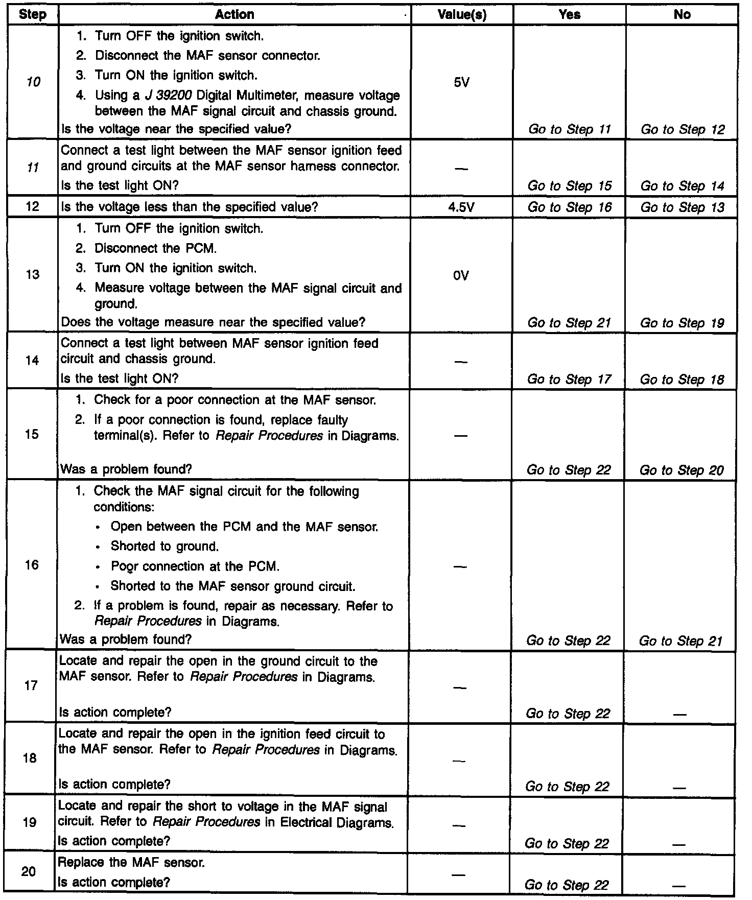 10. A voltage reading of less than 4 or over 6 volts at the MAF sensor signal circuit indicates a fault in the wiring or a poor connection.