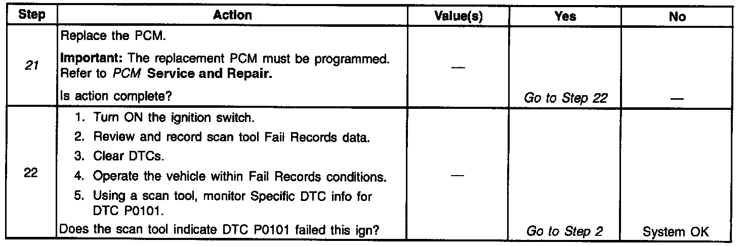 If DTC P0101 cannot be duplicated, the information included in the Fail Records data can be useful in determining vehicle mileage since the DTC was last set. This may assist in determining how often the DTC sets.