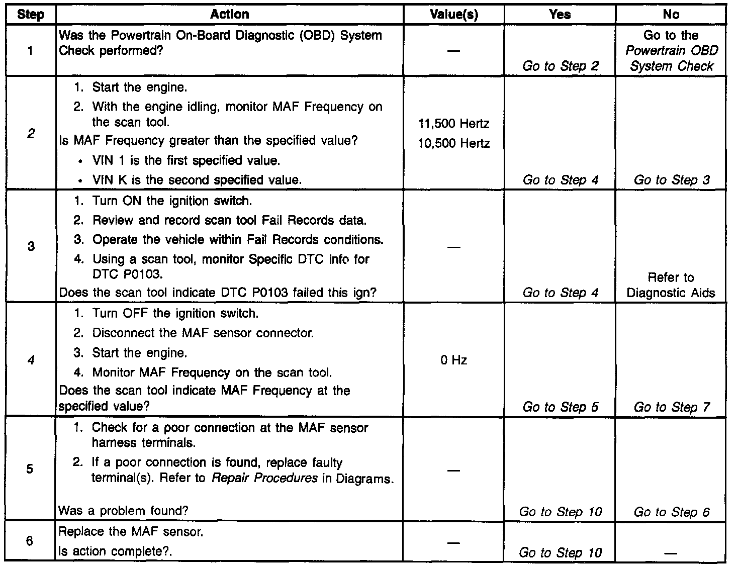 The Mass Air Flow (MAF) sensor measures the amount of air which passes through it into the engine during a given time. The PCM uses the mass air flow information to monitor engine operating conditions for fuel delivery calculations. A large quantity of air entering the engine indicates an acceleration or high load situation, while a small quantity of air indicates deceleration or idle. The MAF sensor produces a frequency signal which can be monitored using a scan tool. The frequency will vary within a range of around 2000 Hertz at idle to about 10,000 Hertz at maximum engine load. DTC P0103 will be set if the signal frequency from the MAF sensor is higher than the possible range of a normally operating MAF sensor.