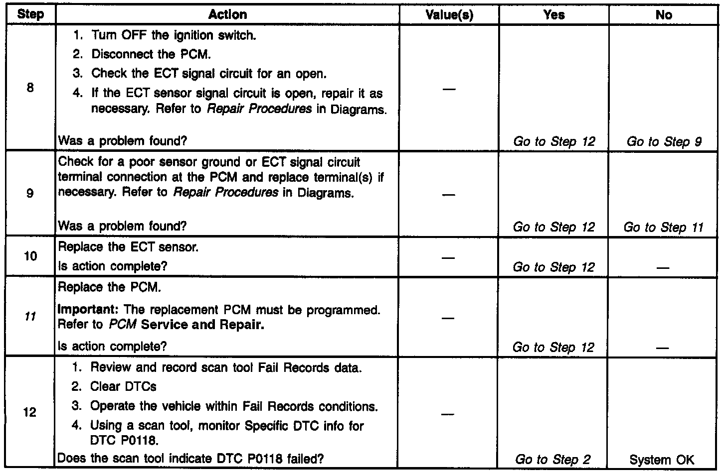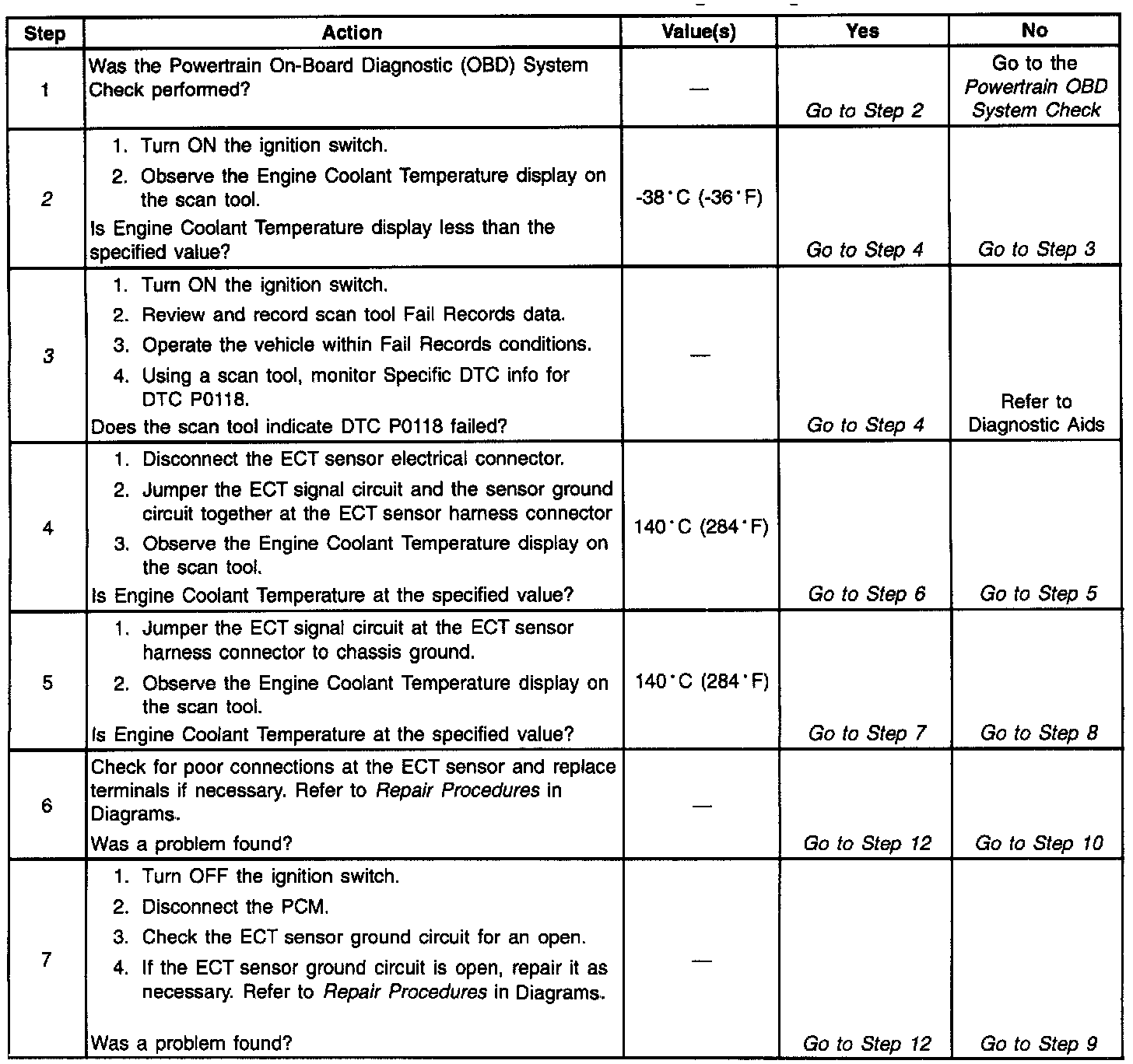 3. If DTC P0118 can be repeated only by duplicating the Fail Records conditions, If DTC P0117 can be repeated only by duplicating the Fail Records conditions, refer to Temperature vs Resistance. The Temperature vs. Resistance table may be used to test the ECT sensor at various temperatures to evaluate the possibility of a shifted sensor that may be shorted above or below a certain temperature. If this is the case, replace the ECT sensor. If the ECT sensor appears to be OK, the fault is intermittent; refer to Diagnostic Aids.