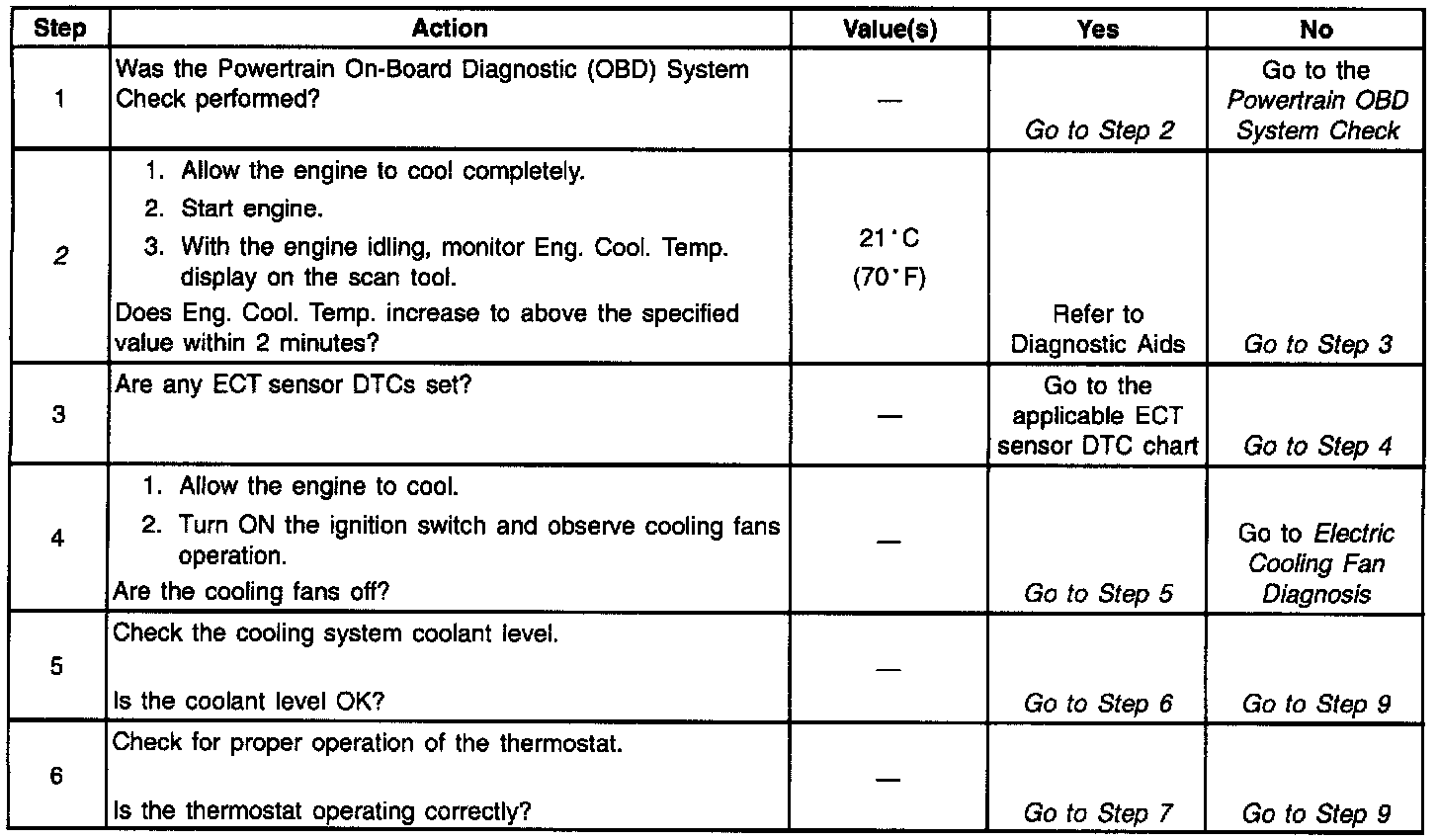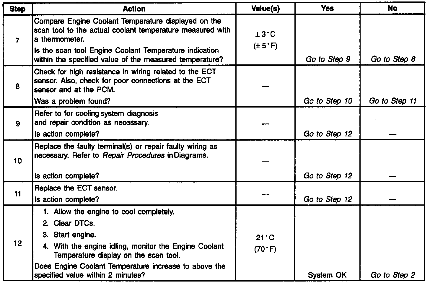 ^ Check for high resistance in wiring related to the ECT sensor. Also, check for poor connections at ECT sensor and PCM. Refer to Troubleshooting Procedures in Diagrams.