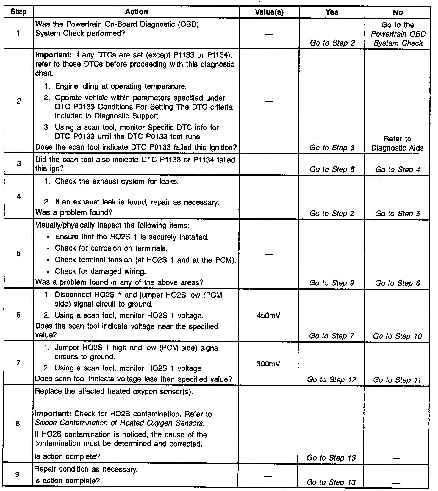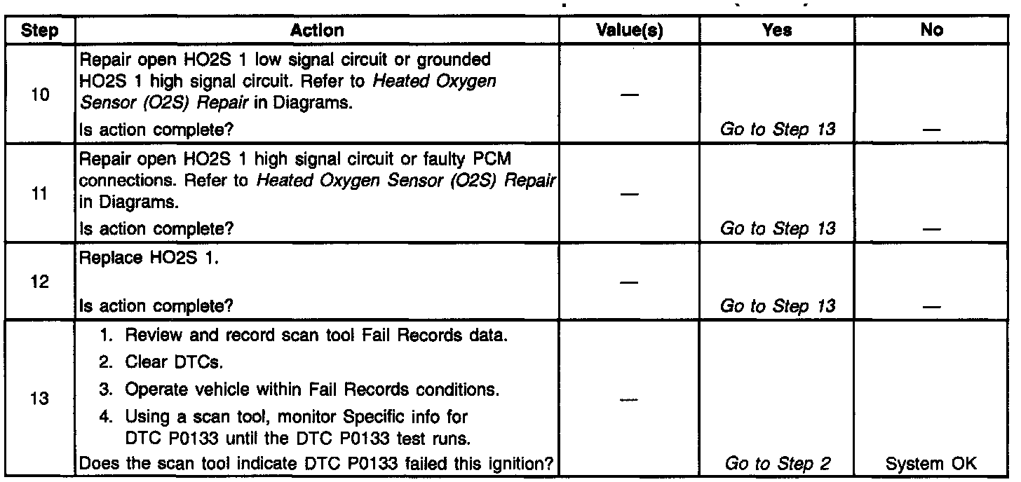 ^ Damaged harnesses. Inspect the wiring harness for damage. If the harness appears to be OK, observe the H02S 1 display on the scan tool while moving connectors and wiring harnesses related to the sensor. A change in the display will indicate the location of the fault. if DTC P0133 cannot be duplicated, Reviewing the Fail Records vehicle mileage since the diagnostic test last failed may help determine how often the condition that caused the DTC to be set occurs. This may assist in diagnosing the condition.