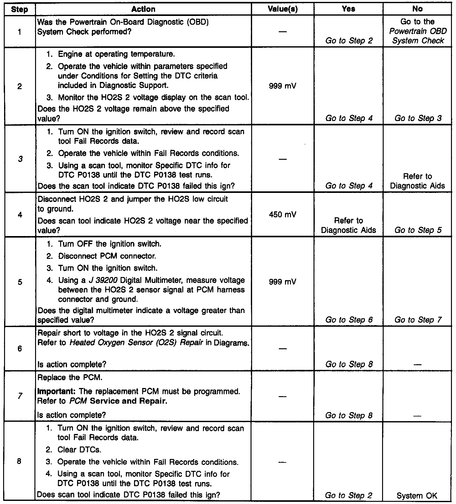 The PCM supplies a bias voltage of about 450 mV between the HO2S signal and low circuits. When measured with a 10 megohm digital voltmeter, this may display as low as 320 mV. The oxygen sensor varies the voltage within a range of about 1000 mV when the exhaust is rich, down through about 10 mV when exhaust is lean. The PCM constantly monitors the HO2S signal during closed loop operation and compensates for a rich or lean condition by decreasing or increasing injector pulse width as necessary. If the HO2S 2 voltage remains excessively high for an extended period of time, DTC P0138 will be set.