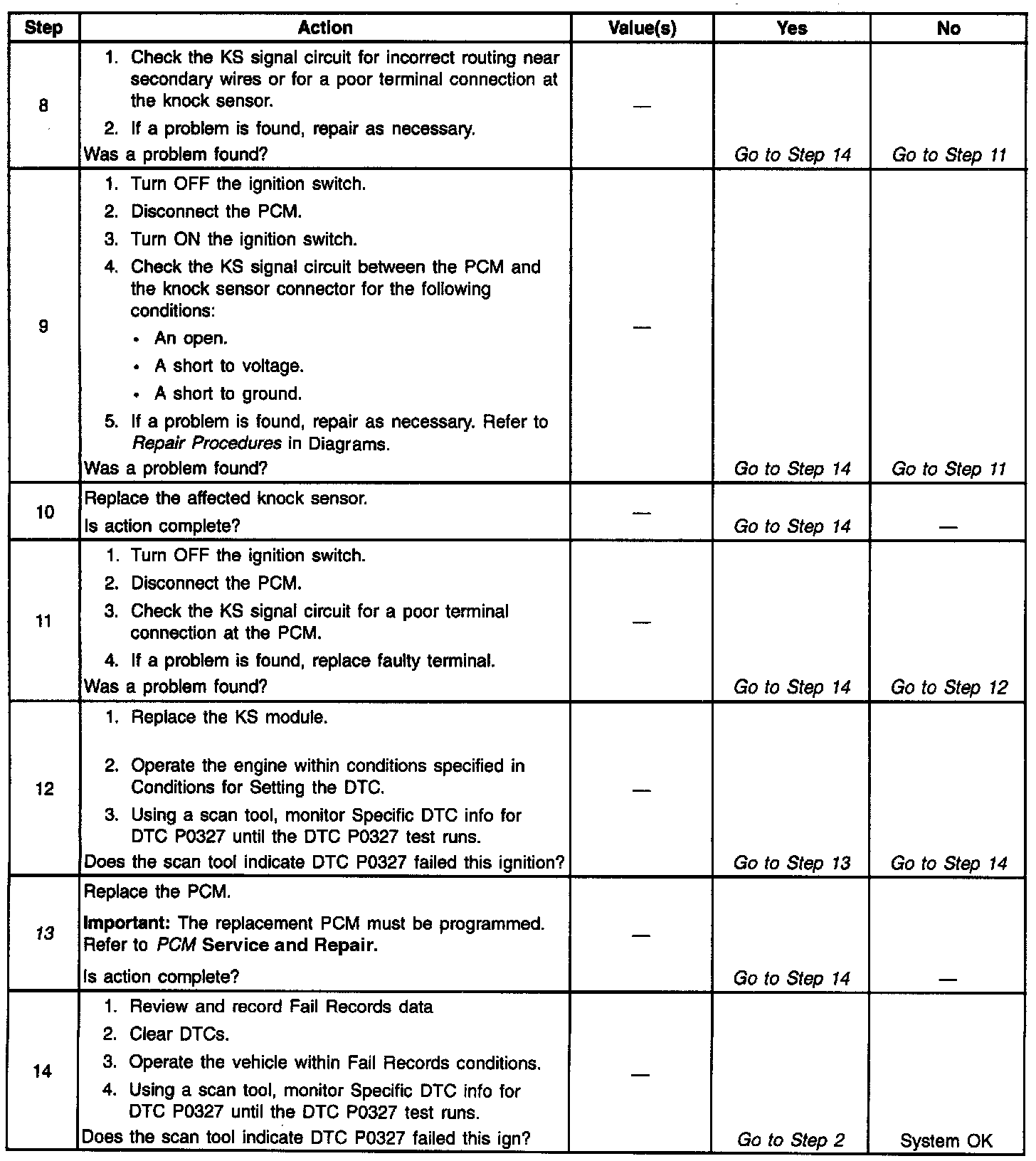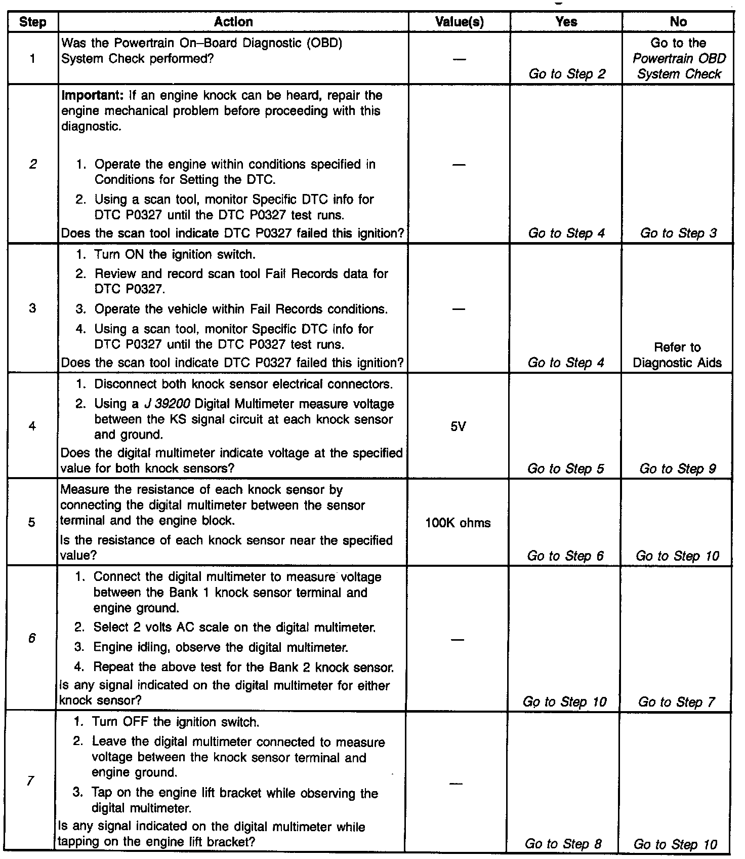 The PCM determines whether the knock sensors and related wiring are operating properly by monitoring the voltage level on the noise channel. The noise channel allows the PCM to diagnose the KS system by allowing the PCM to learn the amount of normal engine mechanical noise present. Normal engine noise varies depending on engine speed and load. When the PCM determines that an abnormally low noise channel voltage level is being experienced, a DTC P0327 will set.