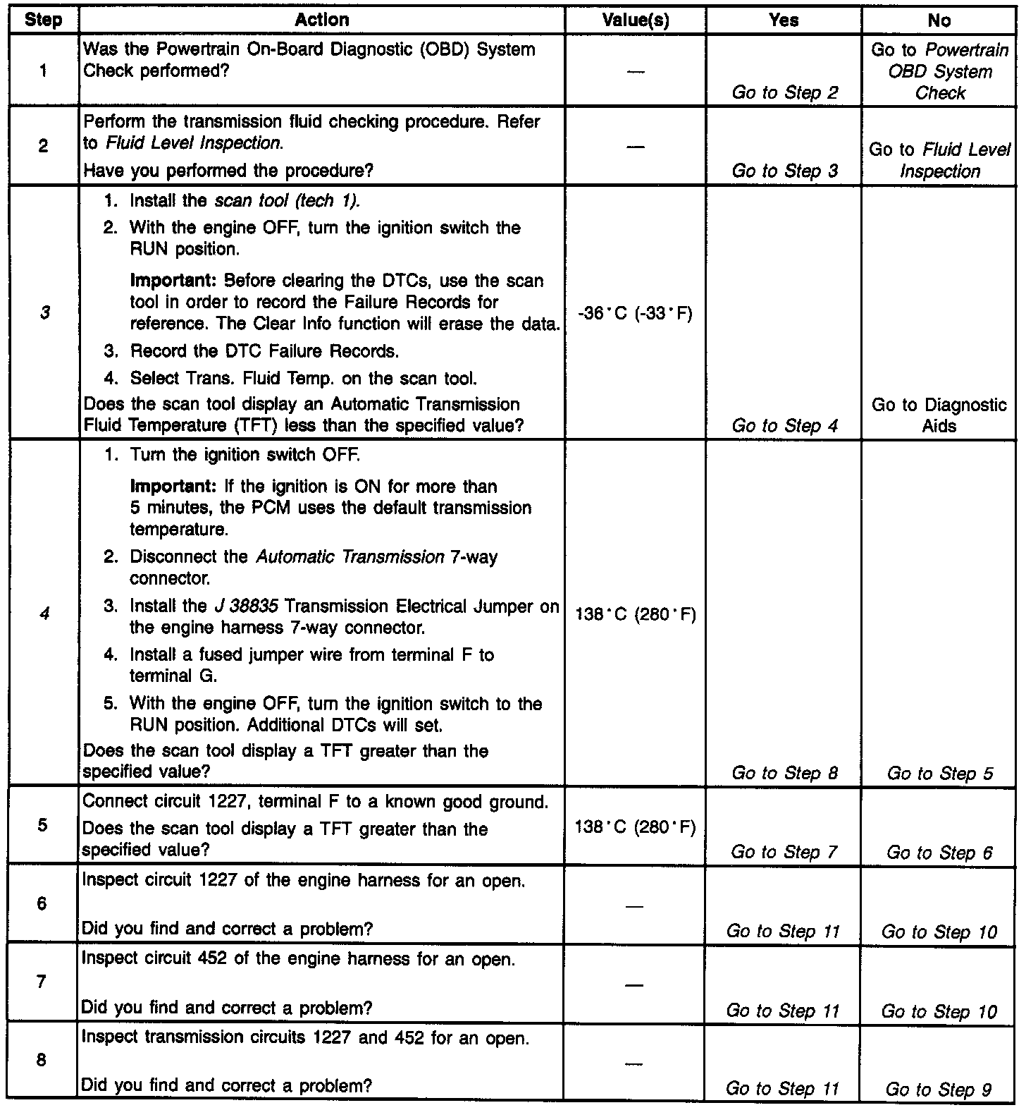 The Automatic Transmission Fluid Temperature (TFT) sensor is a negative coefficient thermistor. The sensor resistance changes with temperature. The Powertrain Control Module (PCM) provides a 5-volt reference to the sensor on circuit 1227. An open in circuit 1227 or circuit 452 results in high signal voltage. The TFT operating range is from -40 to +14O°C (-40 to +284°F).