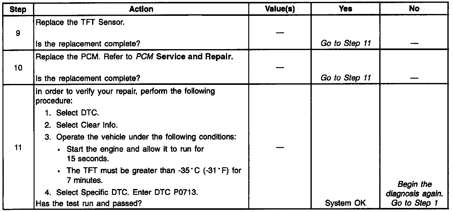 When the PCM detects a voltage input greater than 4.92 volts in the TFT Sensor circuit, then DTC P0713 sets. DTC P0713 is a type A DTC.