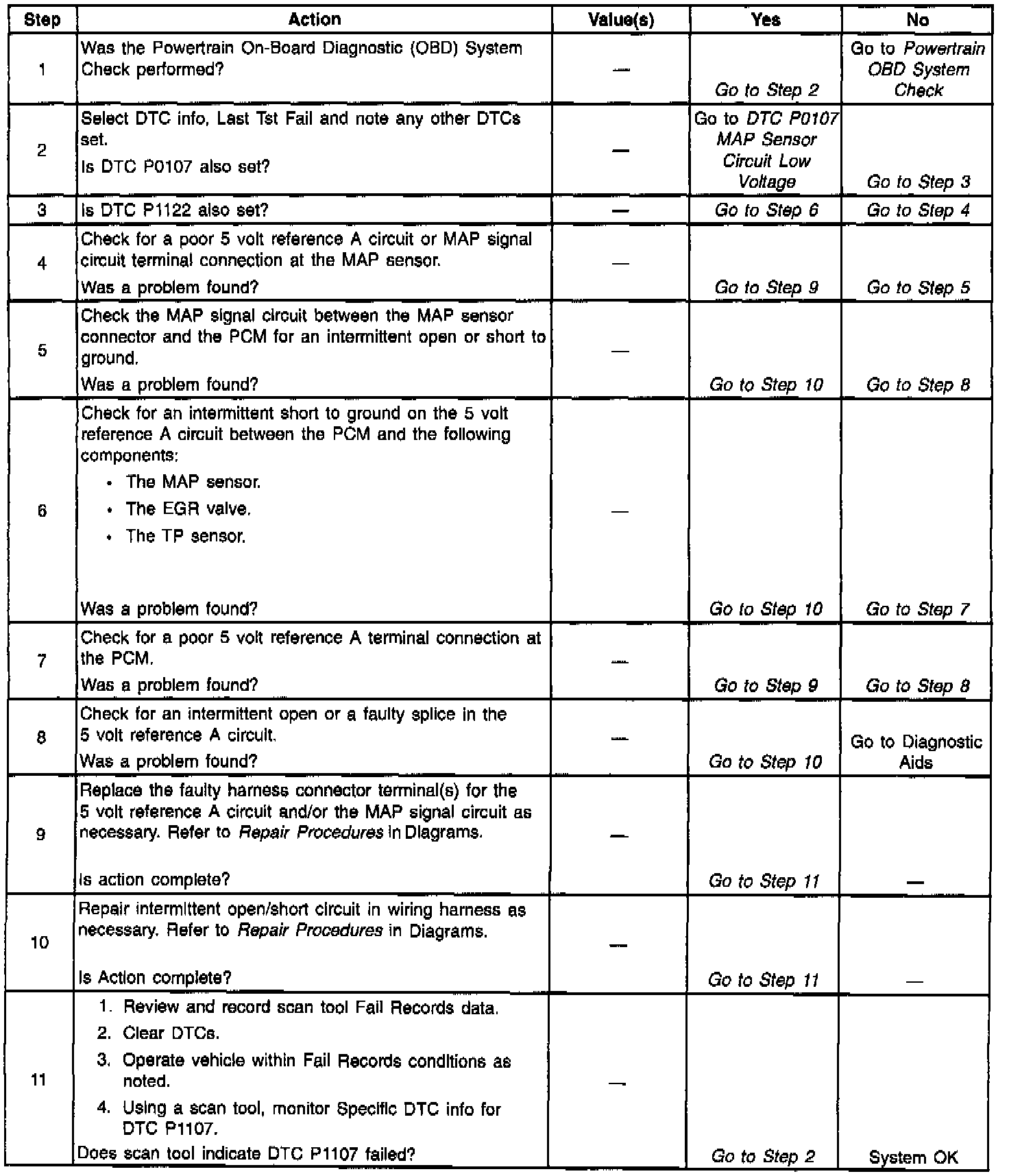 The PCM monitors the MAP signal for voltages outside the normal range of the MAP sensor. If the PCM detects a MAP signal voltage that is intermittently low, DTC P1107 will be set.