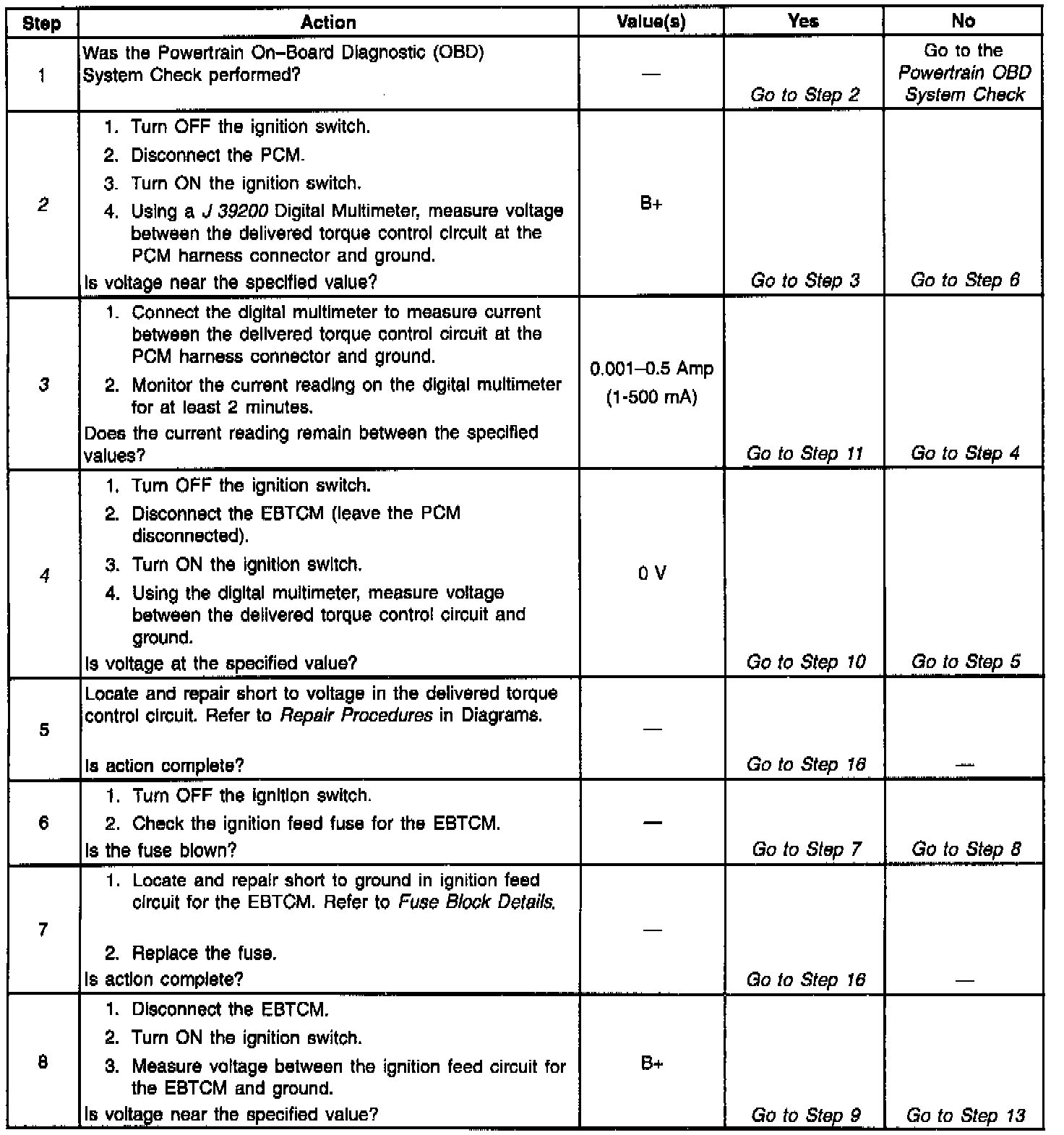 ^ If the harness appears to be OK, disconnect the PCM, turn the ignition ON and observe a digital multimeter connected between the Traction Control Delivered Torque driver circuit and ground at the PCM harness connector while moving connectors and wiring harnesses related to the EBTCM. A change in voltage will indicate the location of the fault.