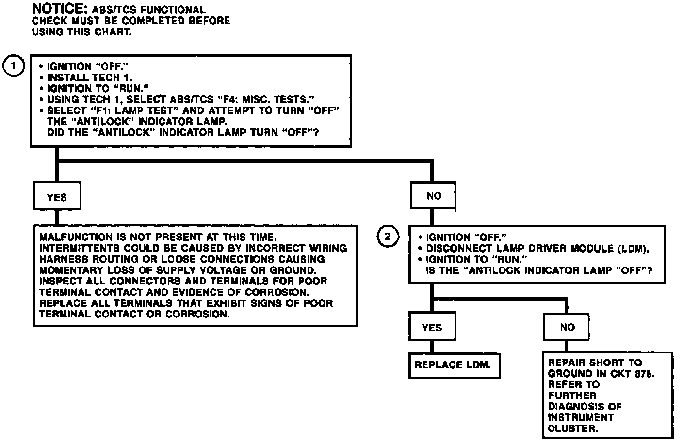 1. Checks if the Tech 1 is able to turn the "ANTILOCK" indicator "OFF" using the Tech 1 ABS/TCS Lamp Test.