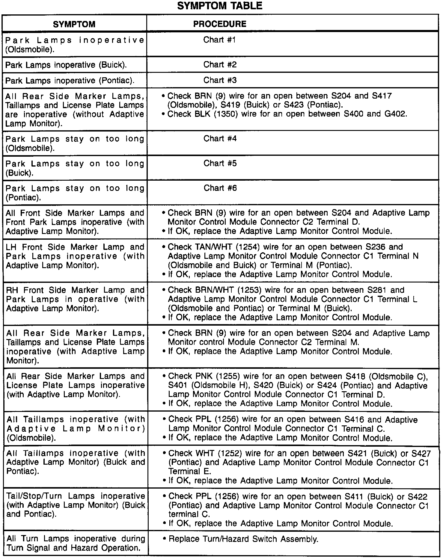 A Symptom Table - Exterior Lights