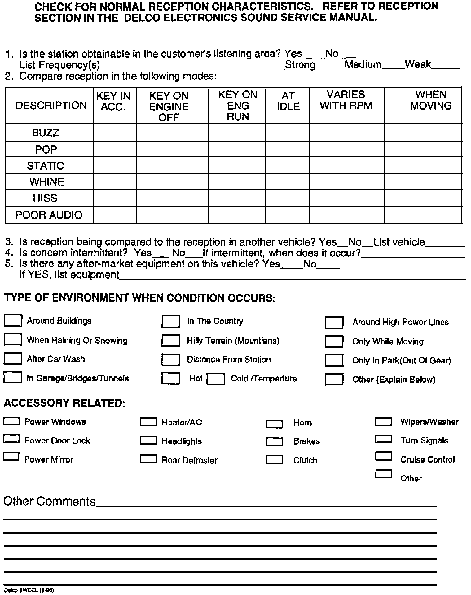 Once the Service Consultant has completed the diagnostic worksheet, it should be attached to the customer repair order for the technician. This worksheet should help the technician determine if the concern is vehicle related or radio related. Two excellent service manuals are also available for this purpose and are available from General Motors at the address shown below. A service bulletin, 34-92-12, Radio Frequency Interference Diagnosis, is also available as is assistance from the Divisional Technical Assistance Centers.