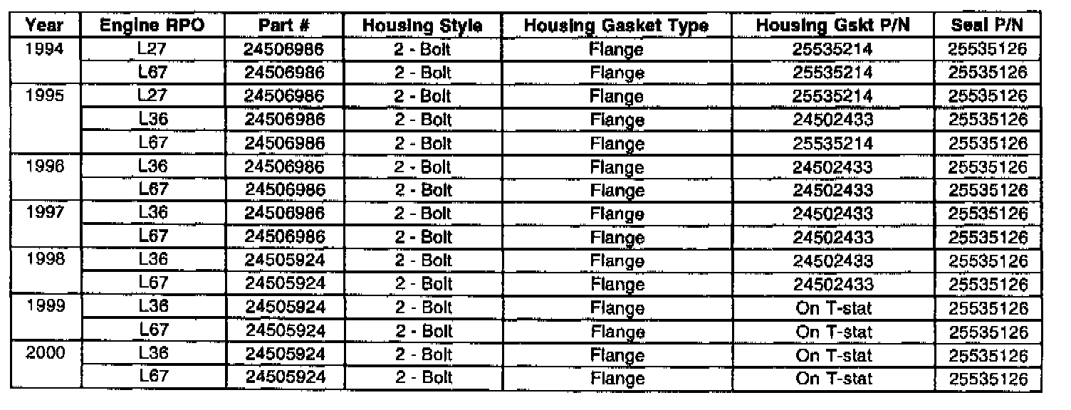 Parts are currently available from GMSPO. The following table contains: part numbers for the thermostats, the type of housing, whether it uses a gasket or 0-ring, and their respective part numbers. The information is listed by year, then engine RPO code. Use the table to order the correct replacement thermostats.
