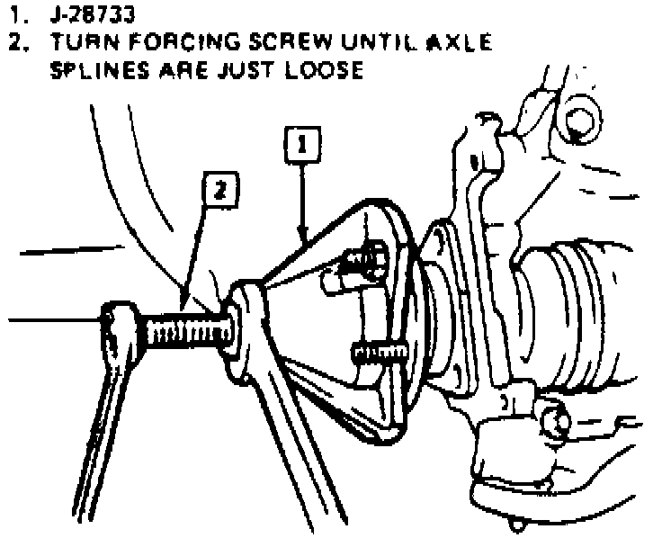 6. Remove drive axle from hub and bearing assembly using front hub spindle remover tool No. J-28733-A, or equivalent, Fig. 8 .