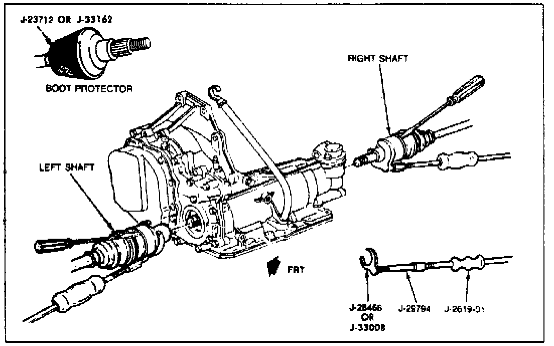7. Remove drive axle from transaxle using axle shaft remover puller tool Nos. J-33008, J-29794 and slide hammer tool No. J-2619-01, or equivalents, if necessary, Fig. 9 .