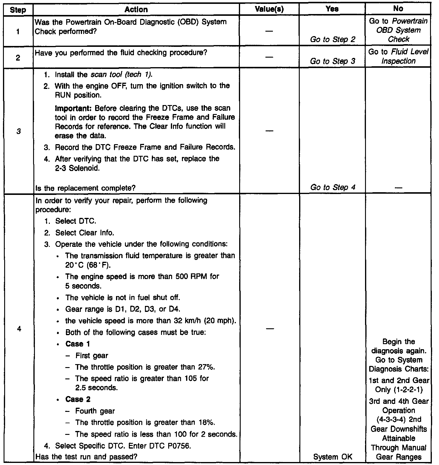 The Powertrain Control Module (PCM) monitors the commanded gear and speed ratio in order to identify a 2-3 Shift Solenoid Valve (2-3 SS Valve) problem. When the PCM detects a gear other than 1st gear when 1st gear is commanded, then DTC P0756 sets. When the PCM detects 1St gear when 4th gear is commanded, then DTC P0756 sets. DTC P0756 is a type B DTC.