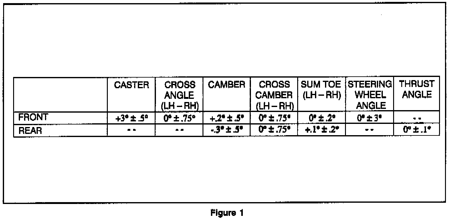 This bulletin revises the alignment specifications for camber adjustment in Section 3A of the Service Manual. The front camber is currently listed at +2° +/- .5°. The correct camber specification is .2° +/- .5°.