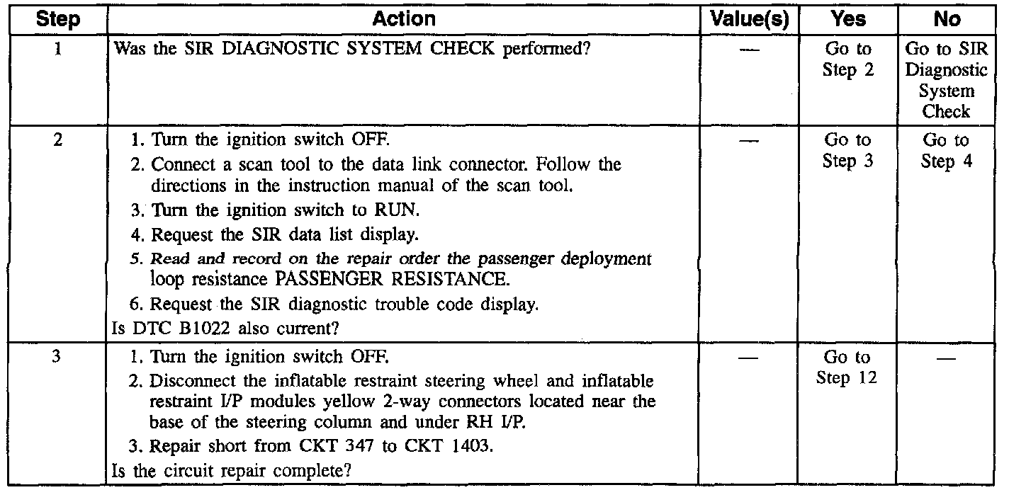 The diagnostic table directs the technician to note the entry value of PASSENGER RESISTANCE. Comparing the value of PASSENGER RESISTANCE over multiple ignition cycles can be helpful in determining if an intermittent condition exists.