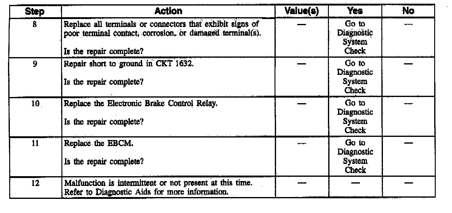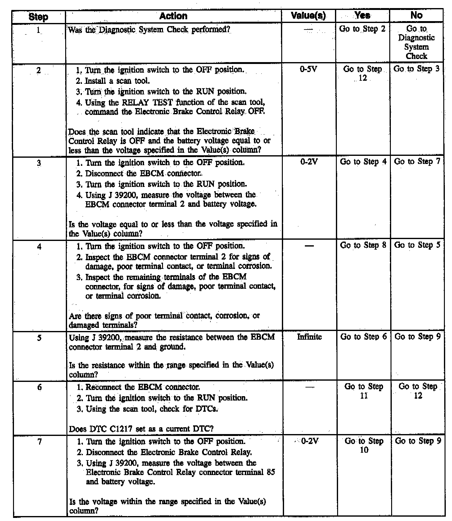 DTC C1217 can be set before the EBCM commands the Electronic Brake Control Relay ON. This test determines if the Electronic Brake Control Relay is energized when it should not be. This malfunction would not allow the Electronic Brake Control Relay to remove power to the ABS system. If a second malfunction were to occur that requires the Electronic Brake Control Relay to be turned OFF, that malfunction cannot be removed if the relay cannot be controlled.