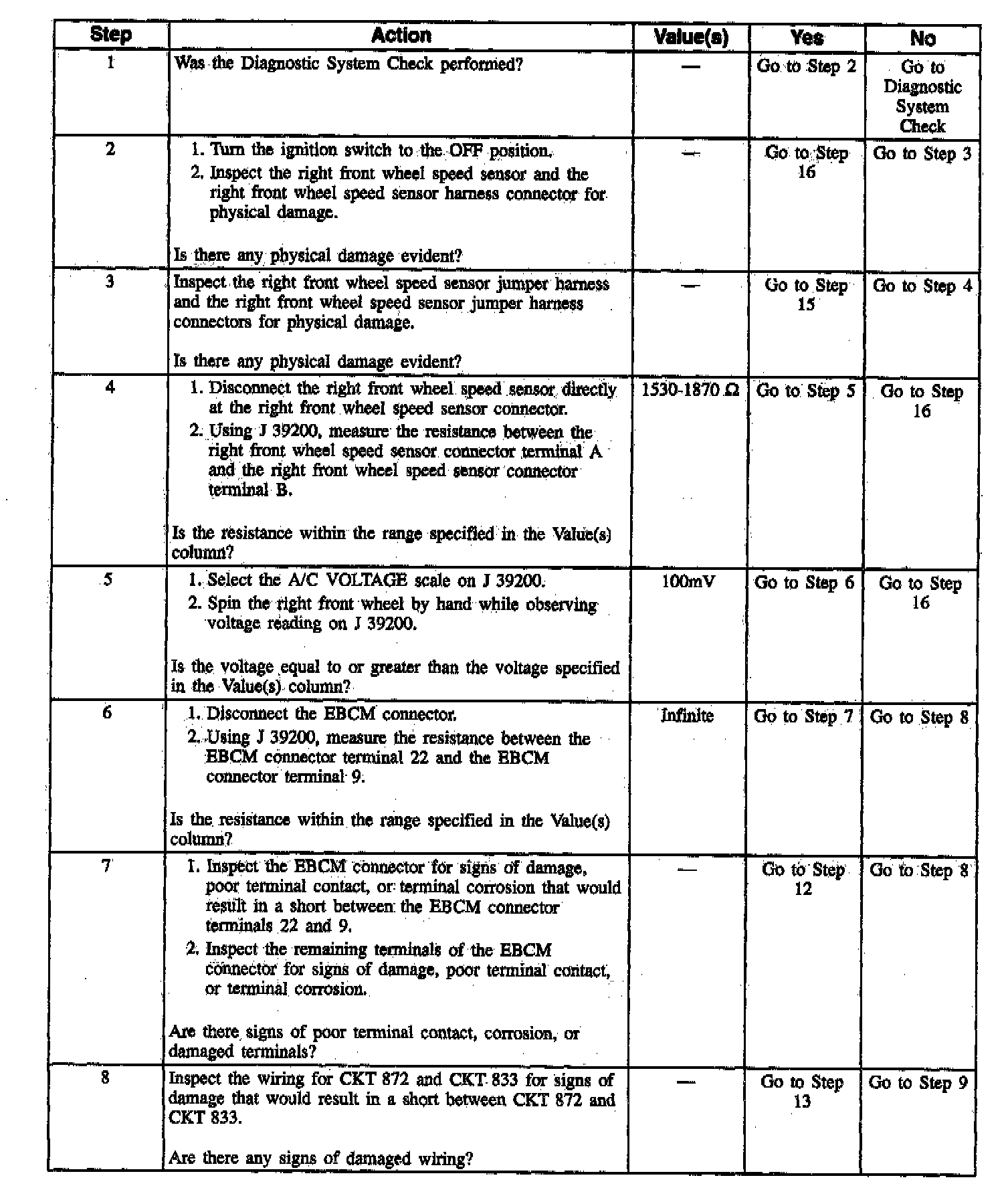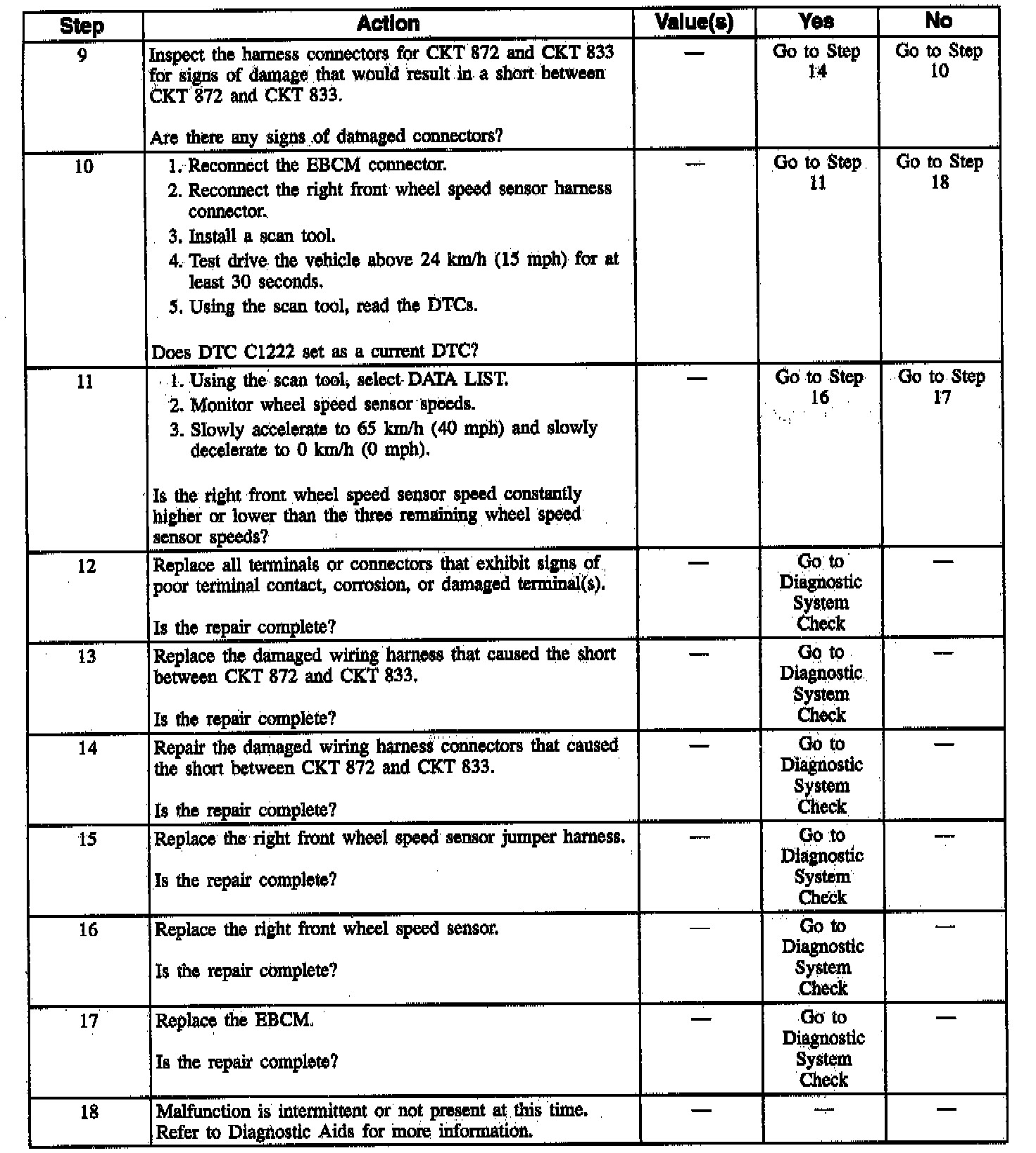 DTC C1222 can be set when the vehicle is not in an ABS stop. If the right front wheel speed is equal to zero for two seconds and the vehicle speed is greater than 8 km/h (5 mph), a malfunction exists.