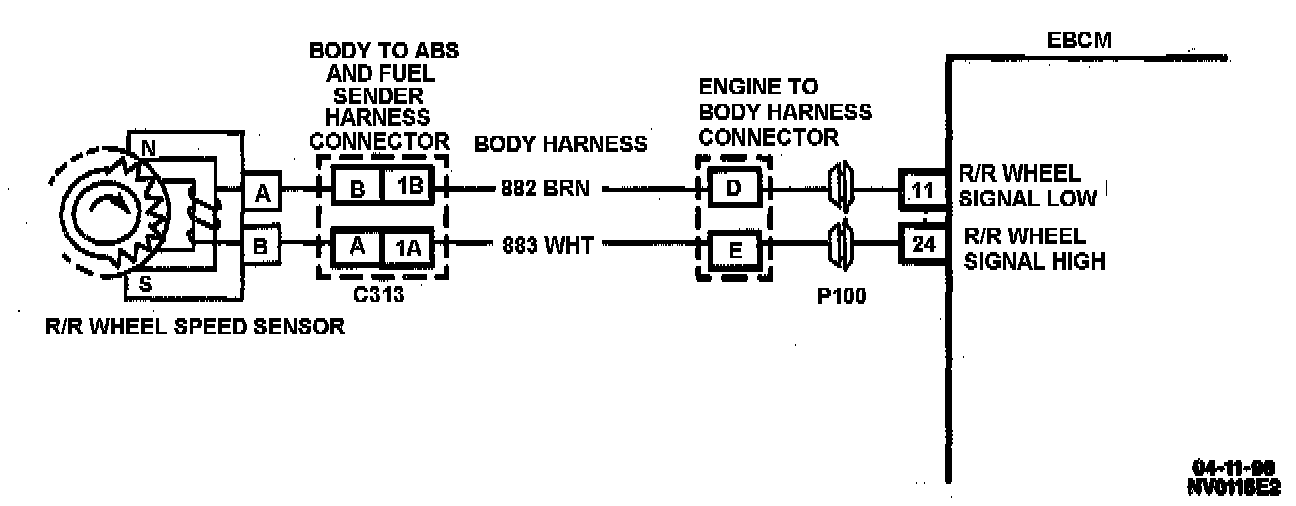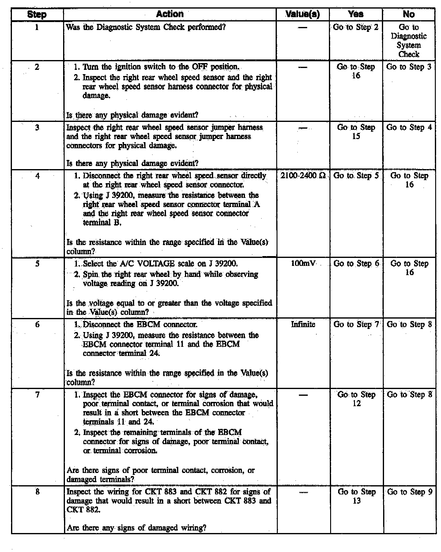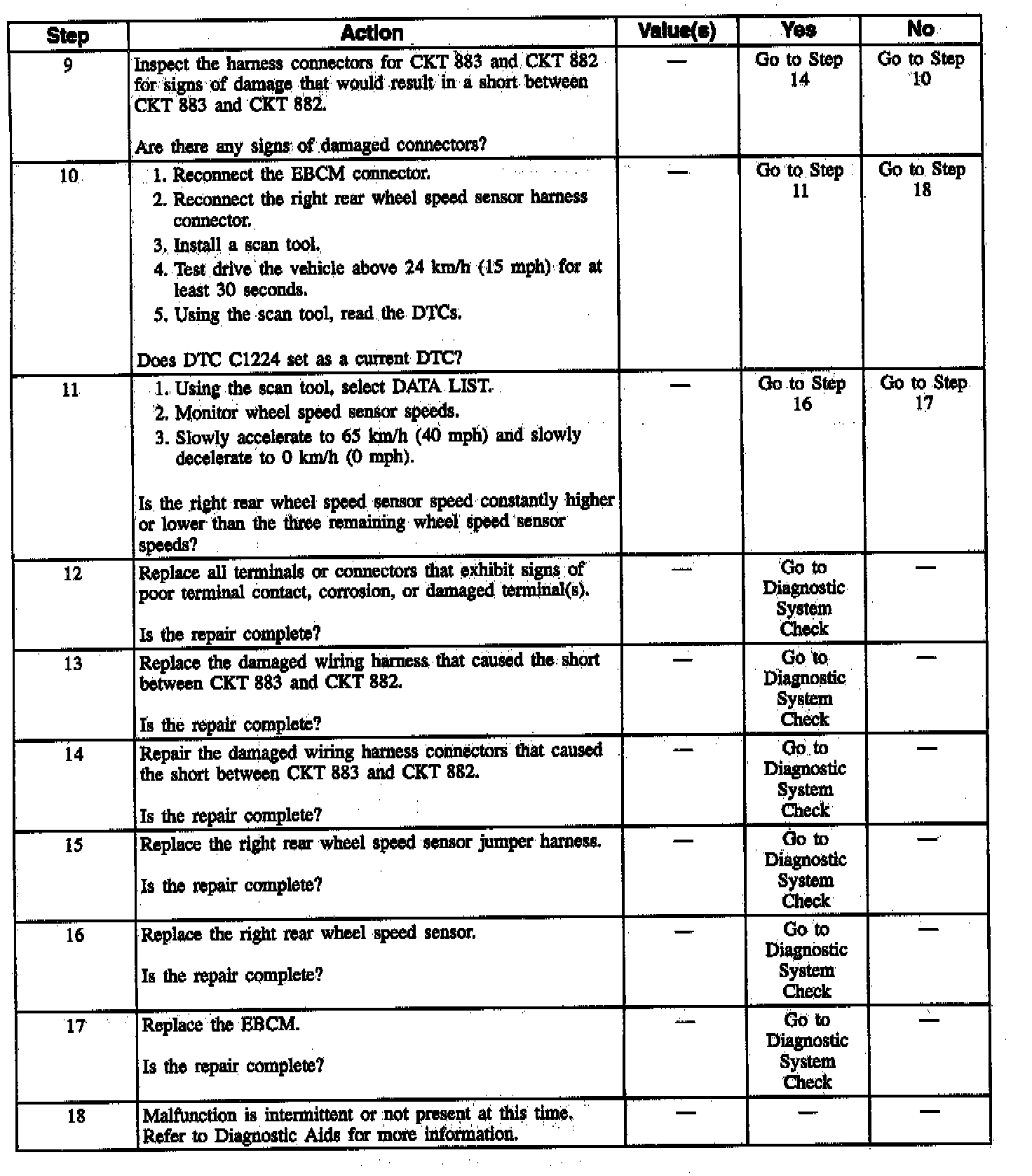 DTC C1224 can be set when the vehicle is not in an ABS stop. If the right rear wheel speed is equal to zero for two seconds and the vehicle speed is greater than 8 km/h (5 mph), a malfunction exists.