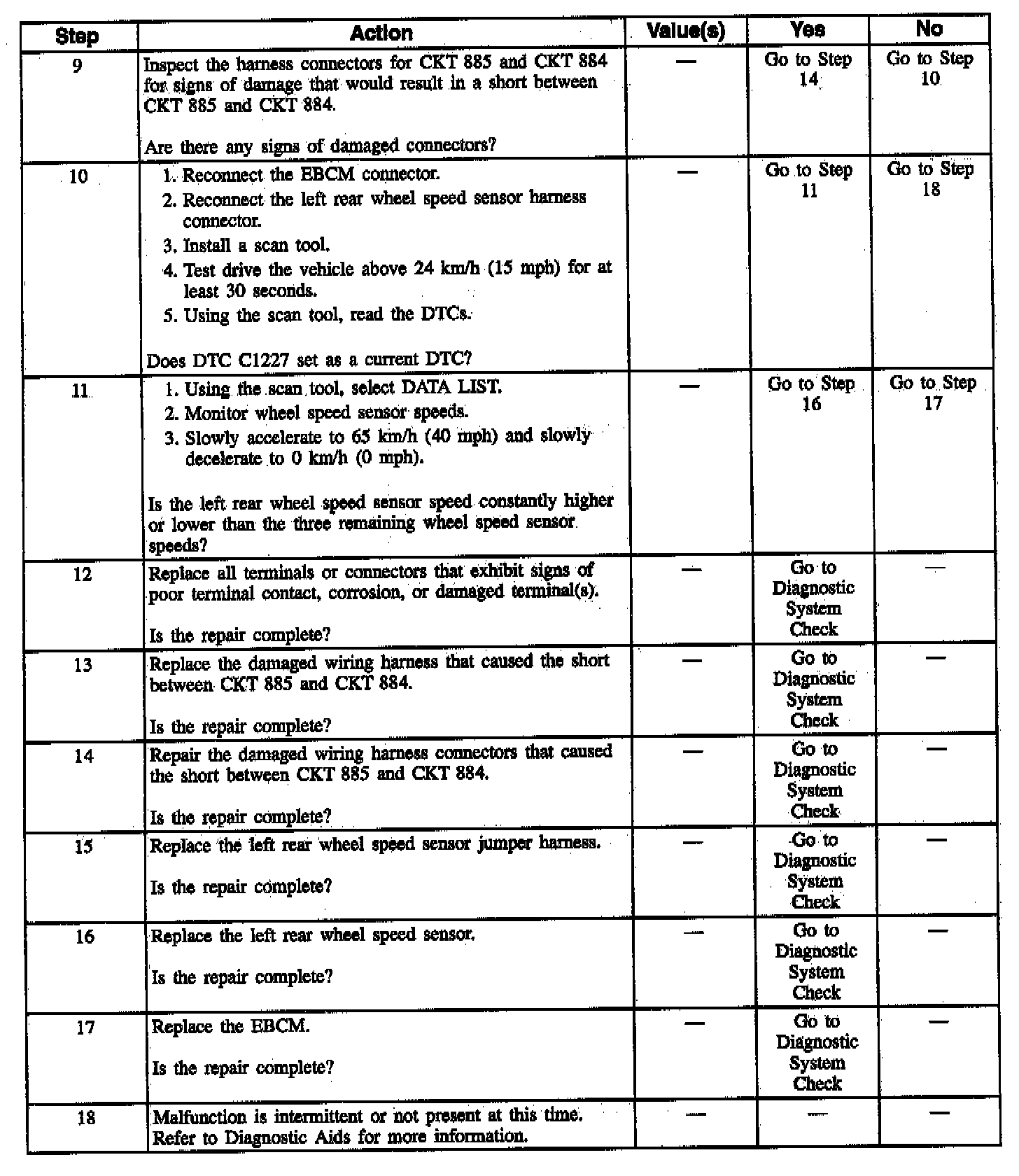 DTC C1227 can only be set when the brake pedal switch is OFF. The purpose of this test is to detect a situation in which the left rear wheel acceleration or deceleration is beyond specified limits.