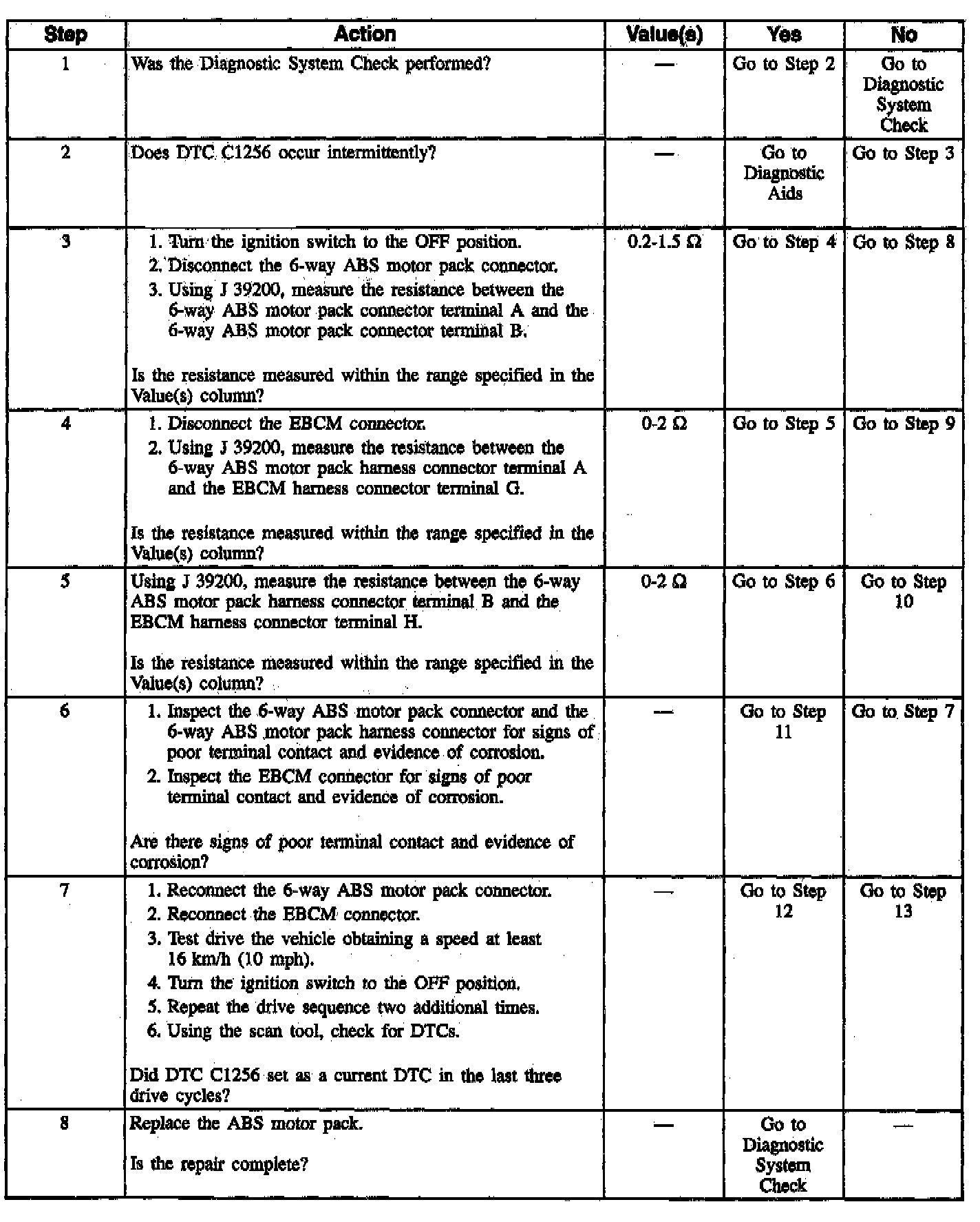 This DTC identifies a motor that cannot be energized due to an open in its circuitry. This malfunction will not allow proper front ABS operation.