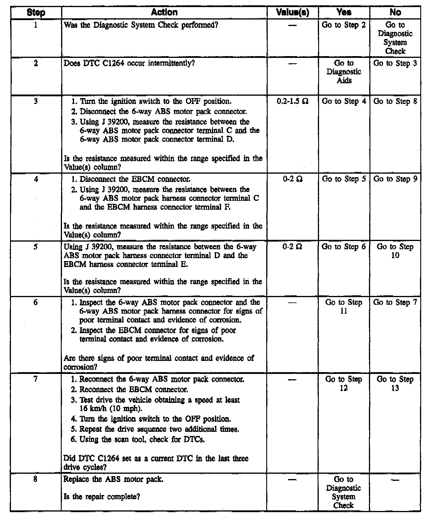DTC C1264 can be set only when the motor is commanded OFF. A malfunction exists if the EBCM detects an out of range voltage in either of the rear ABS motor circuits indicating an open circuit.