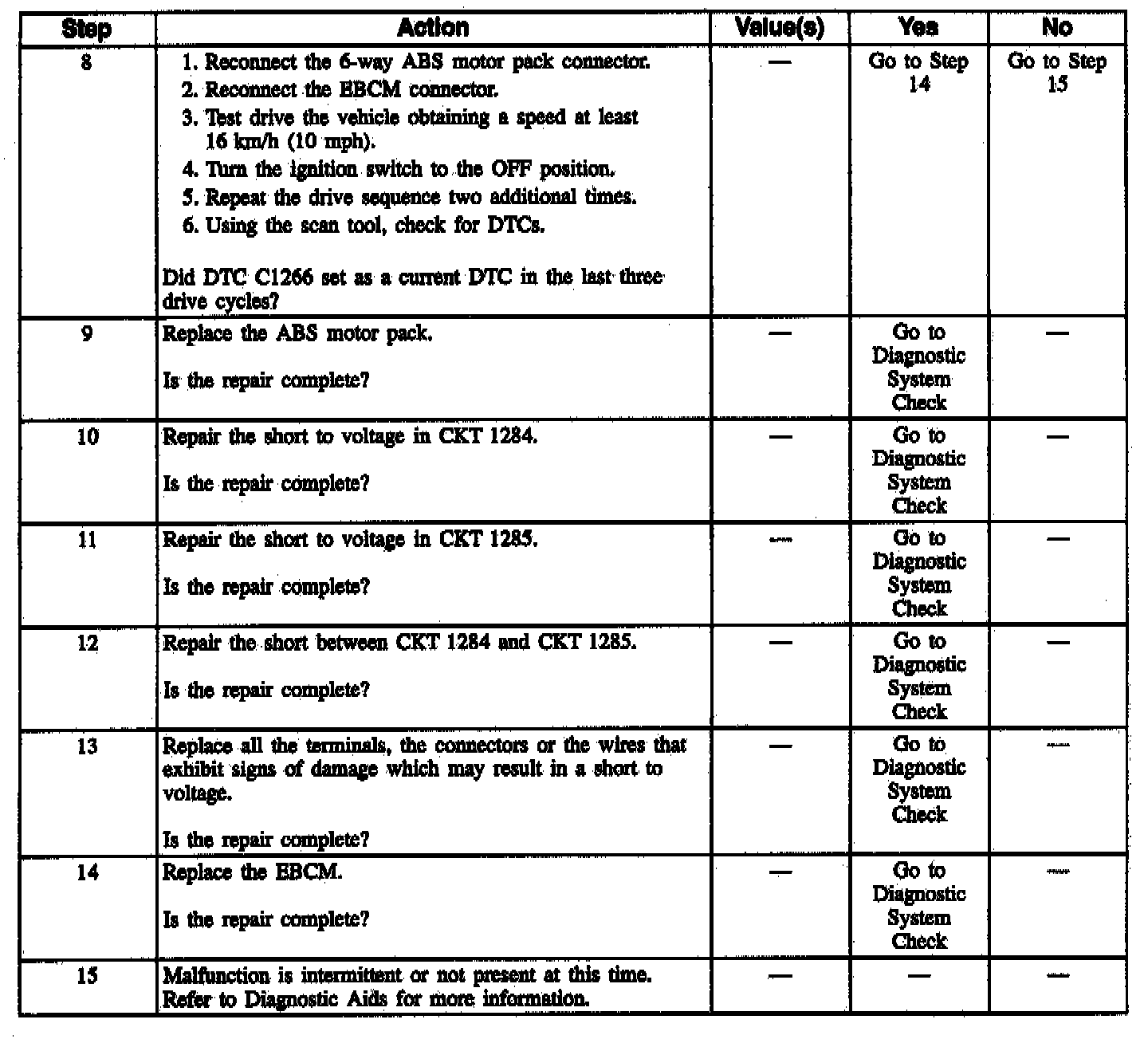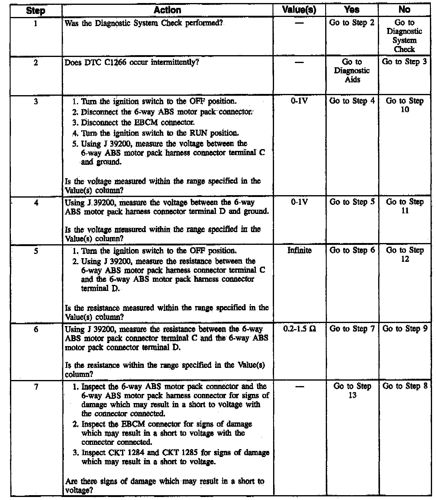 DTC C1266 can be set anytime. A malfunction exists if the EBCM detects an out of range voltage in either of the rear ABS motor circuits indicating a circuit shorted to voltage or a motor shorted.