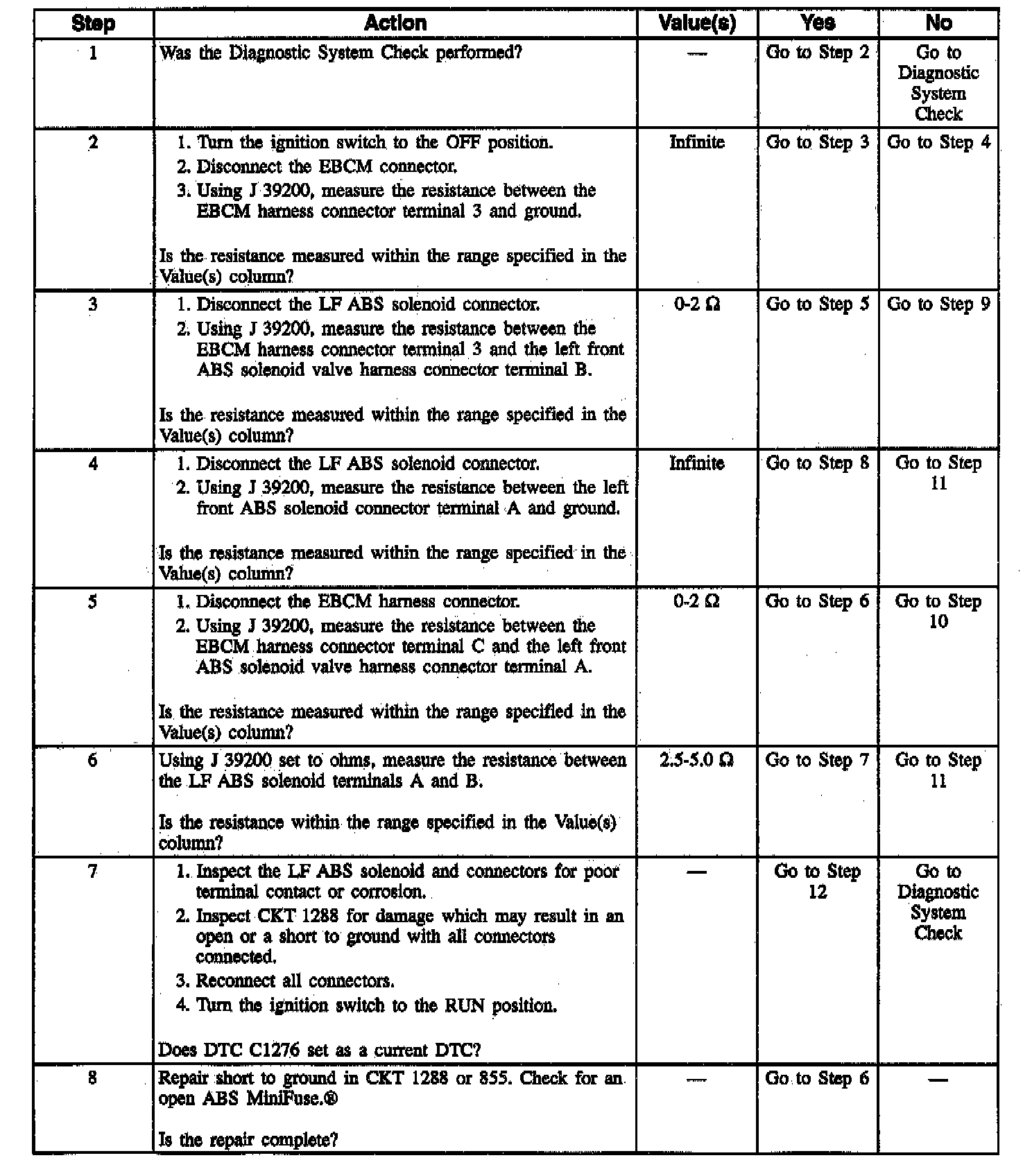 DTC C1276 can be set only when the solenoid is commanded OFF. A malfunction exists if the EBCM detects low voltage in the left front solenoid control circuit.