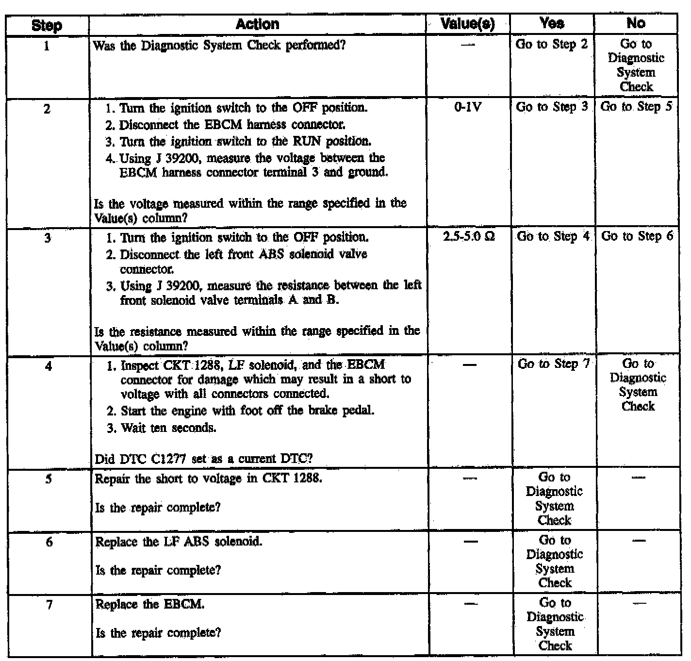 DTC C1277 can be set only when the solenoid is commanded ON. A malfunction exists if the EBCM detects excessive voltage in the left front solenoid control circuit.