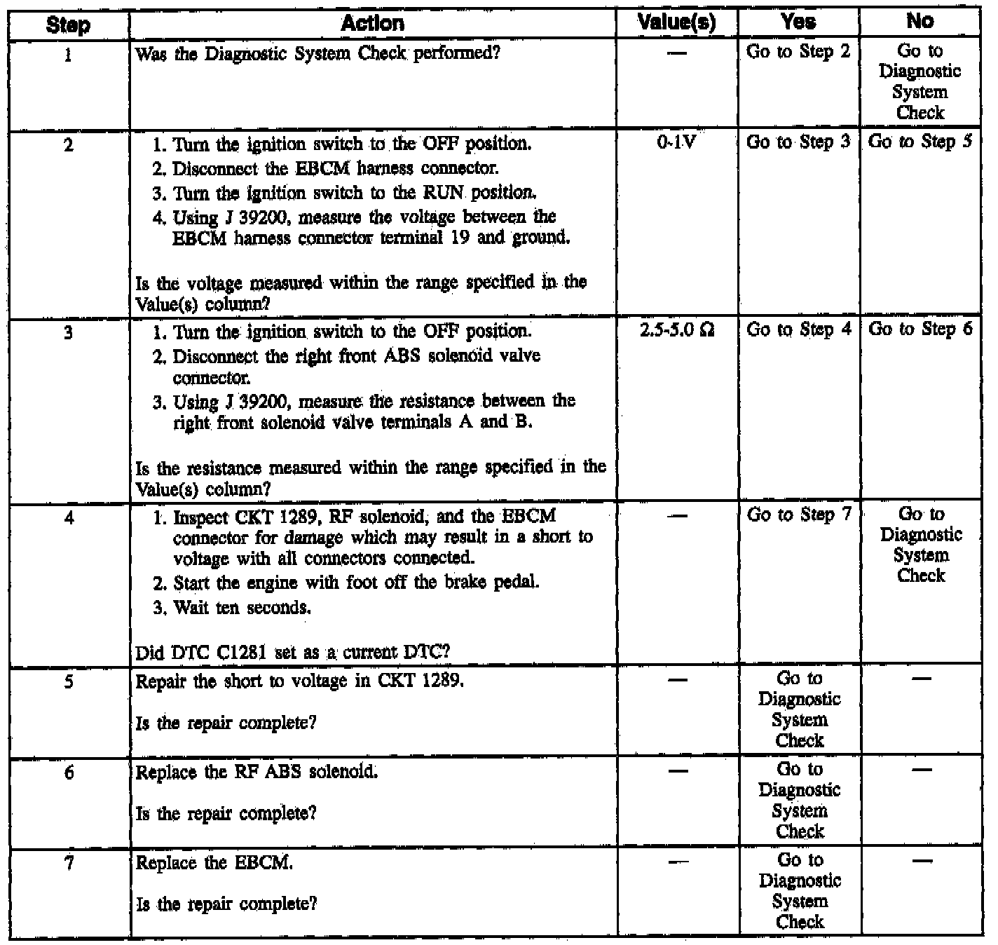 DTC C1281 can be set only when the solenoid is commanded ON. A malfunction exists if the EBCM detects excessive voltage in the right front solenoid control circuit.