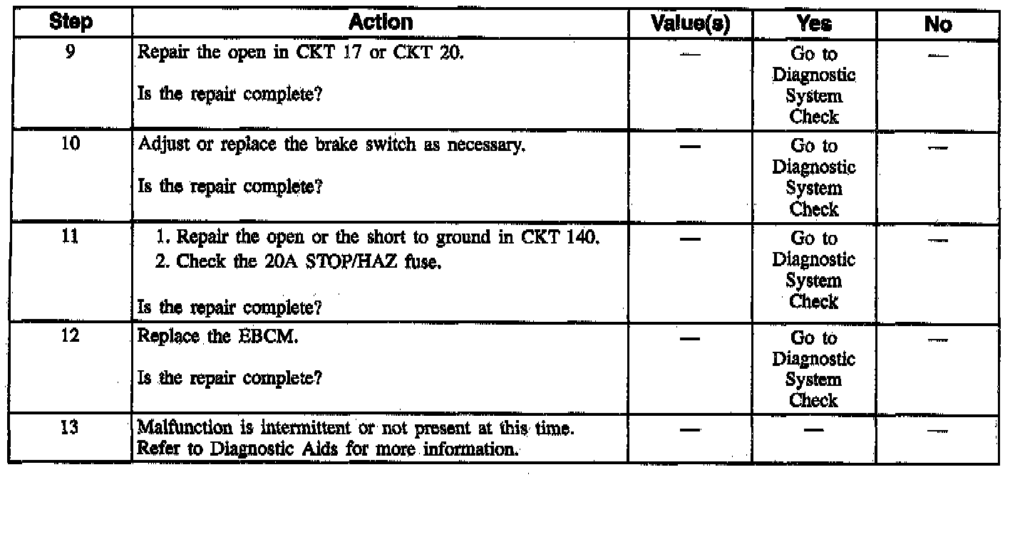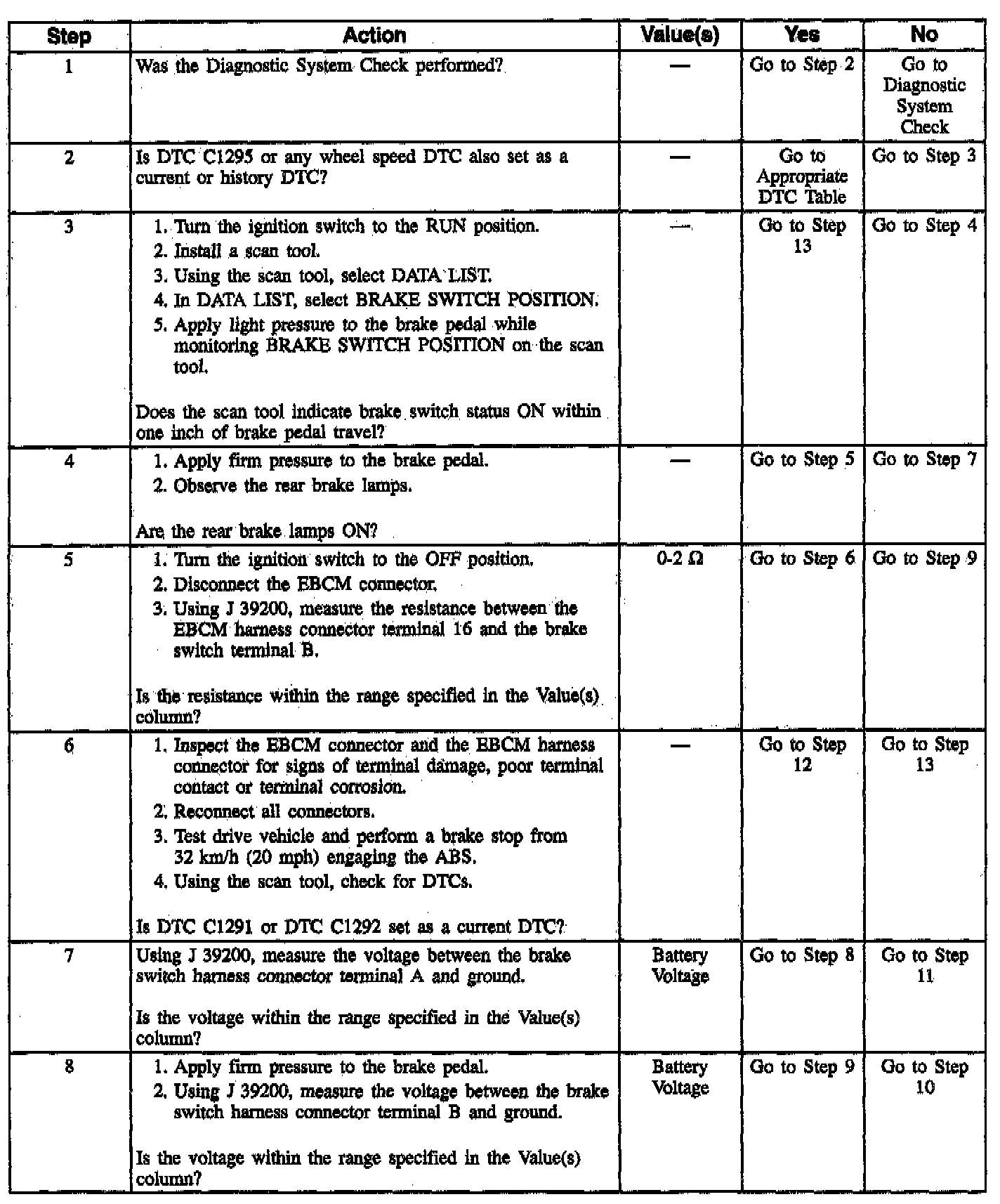 This DTC is used to detect an open brake switch in the non-ABS mode. The EBCM looks for a deceleration rate that would indicate braking action and verifies this assumption by requiring several repeats of this detection method. In each case, ABS will not be available since no brake switch is seen.