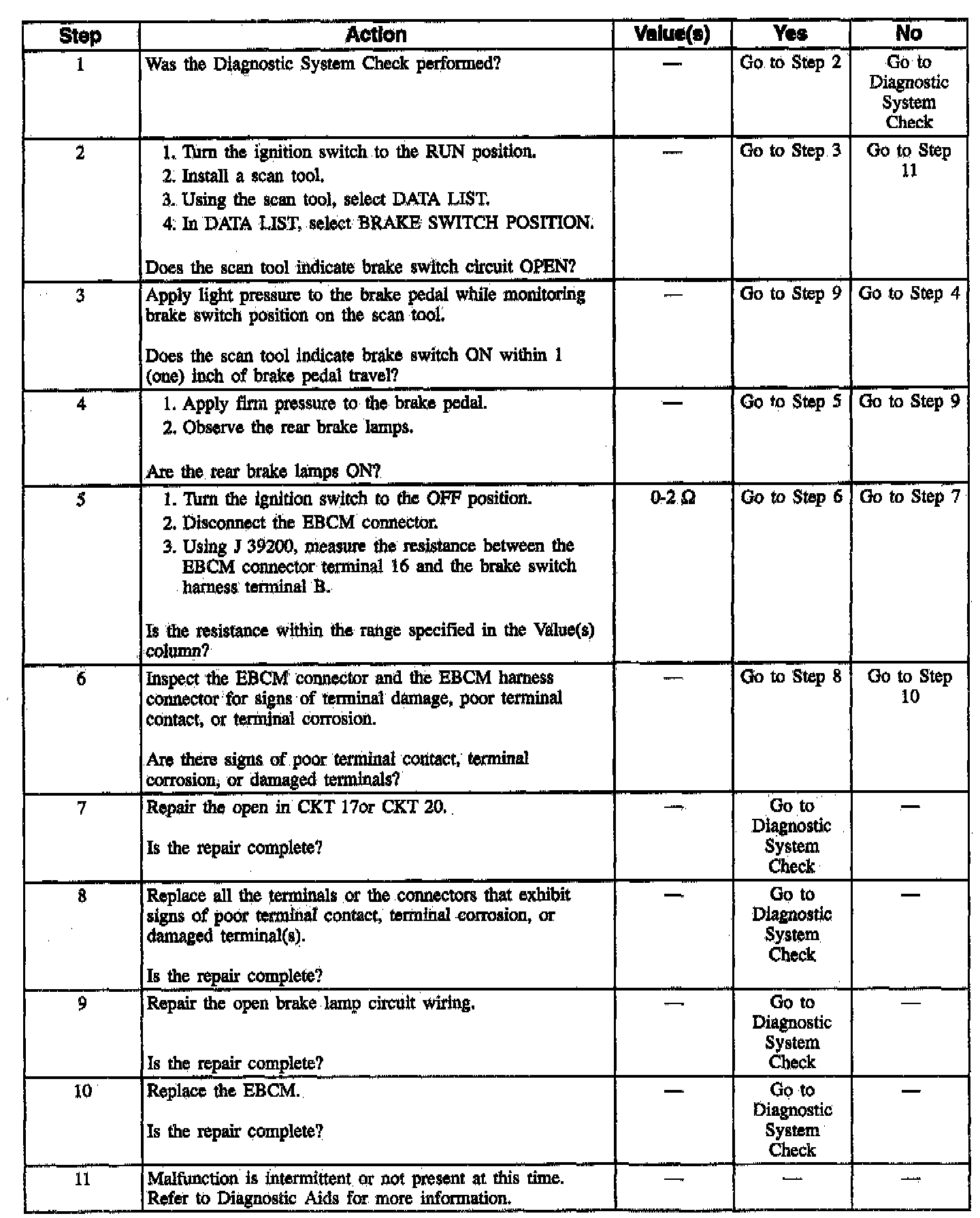 This DTC is used to identify open brake switch circuitry that prevents the brake switch input to the EBCM from changing states when the brake is applied. This DTC is used in conjunction with DTCs C1291 and C1292 to determine the cause of an open brake switch malfunction.