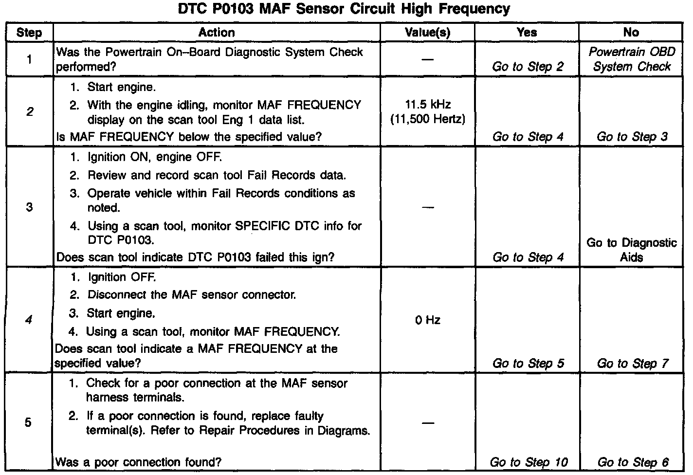The MAF sensor produces a frequency signal which can be monitored using a scan tool. The frequency will vary within a range of around 2000 Hertz at idle to near 10,000 Hertz at maximum engine load. DTC P0103 will be set if the signal from the MAF sensor is above the possible range or a normally operating MAF sensor.