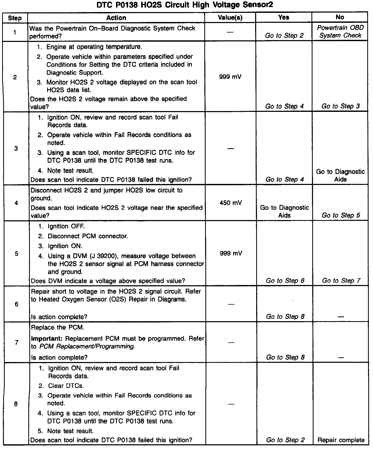 3. DTC P0138 being set during deceleration fuel mode operation may indicate a condition described in the Diagnostic Aids above. If the DTC P0138 test passes while the Fail Records conditions are being duplicated, an intermittent condition is indicated. Reviewing the Fail Records vehicle mileage since the diagnostic test last tailed may help determine how often the condition that caused the DTC to be set occurs. This may assist in diagnosing the condition.