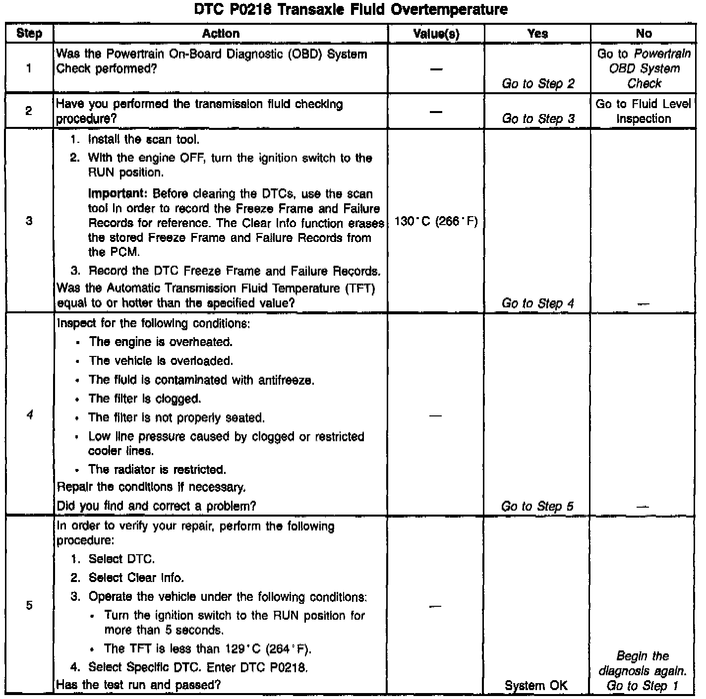 If the PCM detects a high transmission temperature for an extended period of time on the TFT Sensor circuit, then DTC P0218 sets. DTC P0218 is a type D DTC.