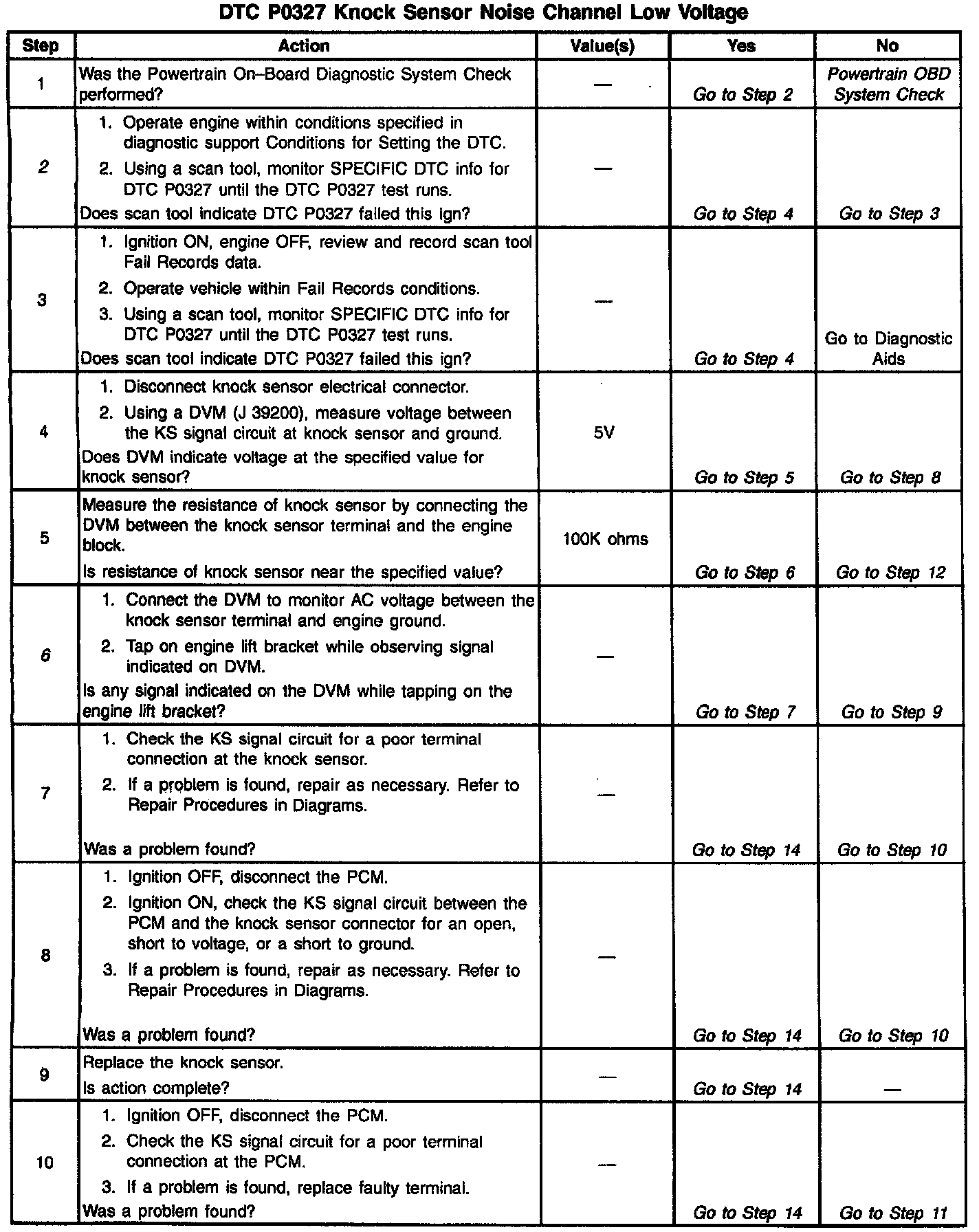 The PCM determines whether knock is occurring by comparing the signal level on the KS circuit with the voltage level on the noise channel. The noise channel allows the PCM to reject any false knock signal by indicating the amount of normal engine mechanical noise present. Normal engine noise varies depending on engine speed and load. When the PCM determines that an abnormally high noise channel voltage level is being experienced, a DTC P0326 will set.